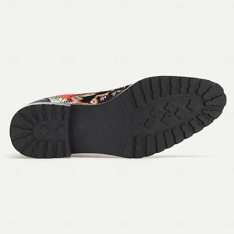 Highlights [Fabric] : Crafted from 100% premium Italian full-grain cowhide leather, these men’s ankle boots offer excellent durability and a luxurious feel. The high-quality leather ensures long-lasting wear and adds a touch of elegance to any ensemble. [Style] : These combat boots feature a vibrant black floral pattern, offering a blend of ruggedness and sophistication. The classic lace-up design provides a customizable fit, ensuring comfort and style for everyday wear. [Design Highlights] : The boots are designed with reinforced leather toe caps and heels for added robustness and protection. The sturdy rubber outsole offers exceptional slip resistance and traction, making them perfect for both urban environments and outdoor adventures. [Occasions] : Ideal for casual outings, city exploration, and outdoor activities, these versatile boots seamlessly combine fashion with functionality. They are perfect for adding a flair to any wardrobe, suitable for any occasion where style and durability are a must. [Size Range] : Available in a variety of sizes, these boots cater to a wide range of men: US8 / EU41 / UK7, US9 / EU42 / UK8, US10 / EU43 / UK9, US11 / EU44 / UK10, US12 / EU45 / UK11, and US13 / EU46 / UK12.