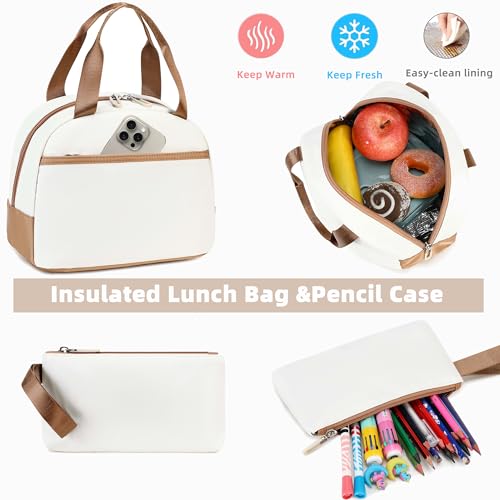 • Multi-pockets & Large Capacity Back packs: The students book bag has 6 separate different size zipper pockets with many compartments and two side pockets meet your daily storage.Main roomy compartment can easily hold a 15.6" laptop, textbooks, magazines, college supplies, travel clothes, phone charger, etc . The reusable insulated lunch bag can hold up to 9.5 liters or 15 cans (330 ml) of drinks, and the pen bag is convenient for storing keys, cards, cell phone, utensils and other small items