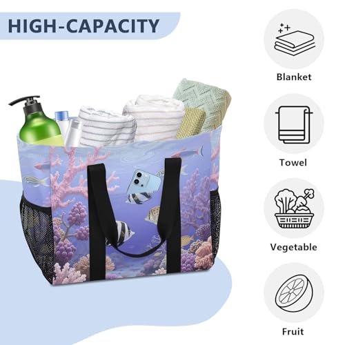 HOT ! Purple Coral and Fish Patterns Beach Tote Pool Bags for Women Ladies Large Waterproof Gym Tote Carry On Bag for Weekender Swim Gym Shopping Travel Daily Bag