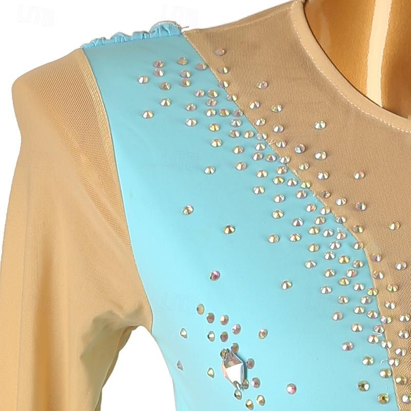 More information about Figure Skating Dress Women's Girls' Ice Skating Dress Lake Blue Patchwork Open Back Mesh High Elasticity Training Competition Skating Wear Classic Crystal / Rhinestone Long Sleeve Ice Skating Figure