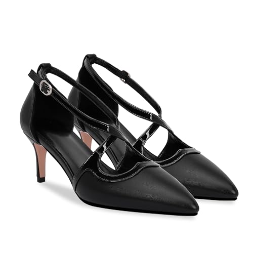 100FIXEO Women's Black Pointed Toe Cross Strappy High Heel Pumps Stylish Comfortable Office Party Footwear 1