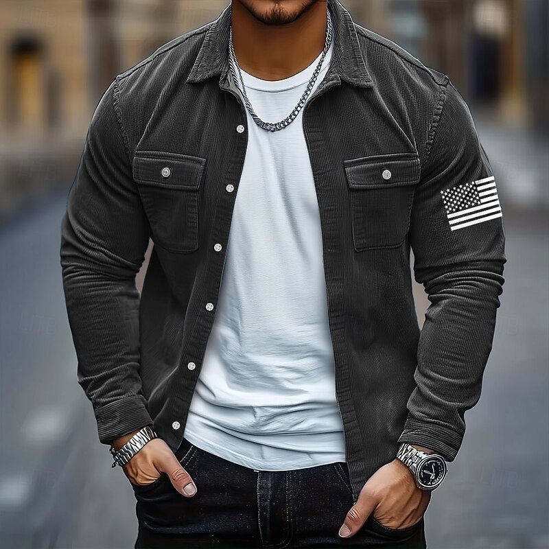 HOT ! Men's American US Flag Corduroy Shirt Shirt Jacket Overshirt Long Sleeve Casual Outdoor Dailywear Fall Winter Turndown Button-Down Warm Jacket with Flap Pockets Blue Green Khaki Dark Gray