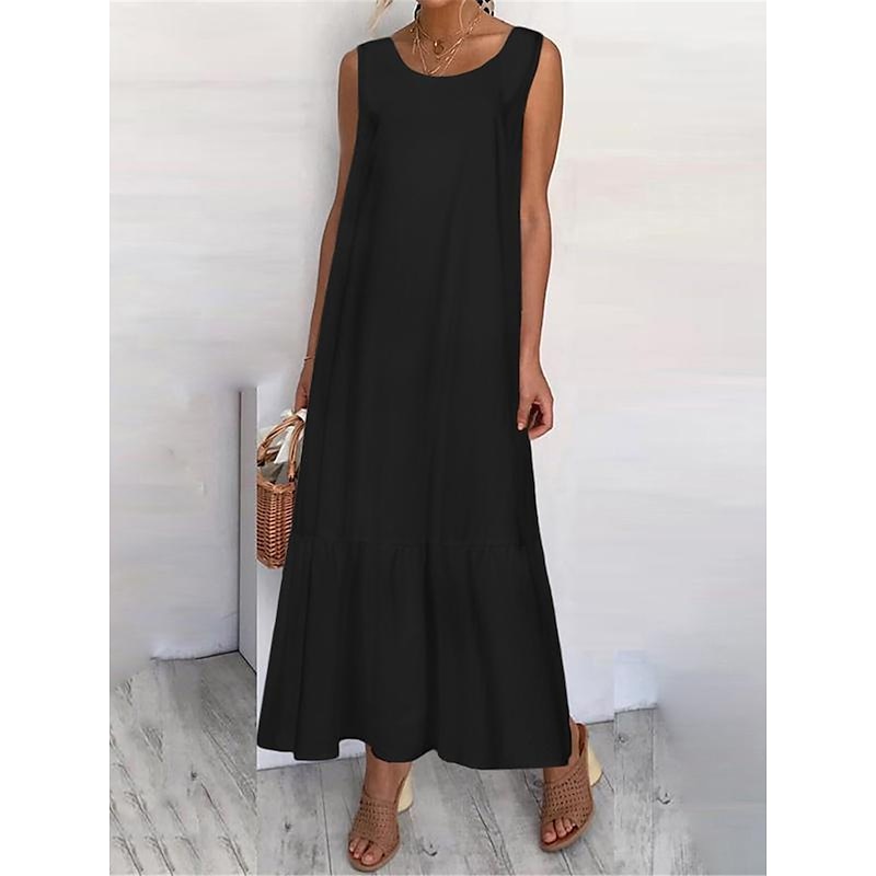 Women's Black White Navy Blue Summer Maxi long Dress Maxi Dress Linen-Inspired Dresses Tank Dress Tiered Dress Solid Basic Casual Vacation Regular Fit Crew Neck 12