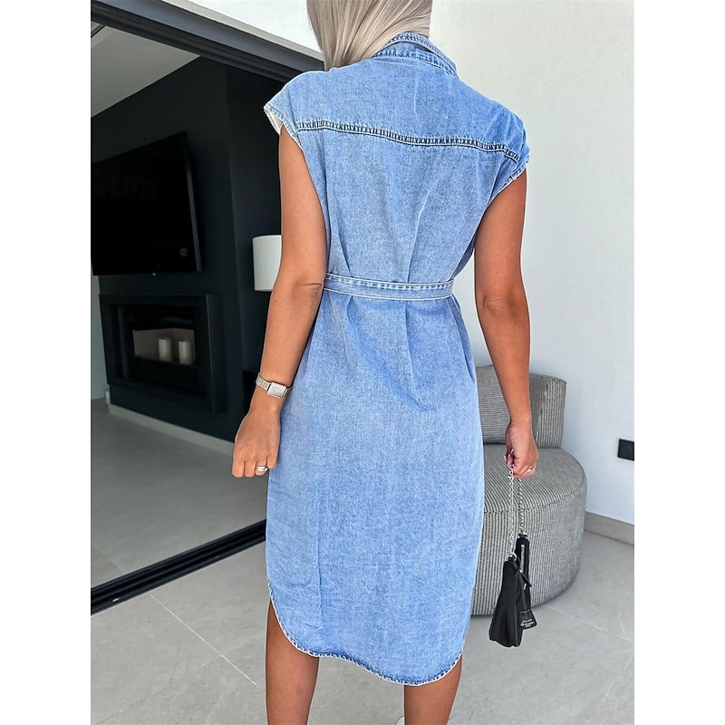 Women's Denim Dress Shirt Dress Midi Dress Date Vacation Denim Basic Modern Shirt Collar Pocket Belted Short Sleeve Summer Spring Regular Fit Plain 11