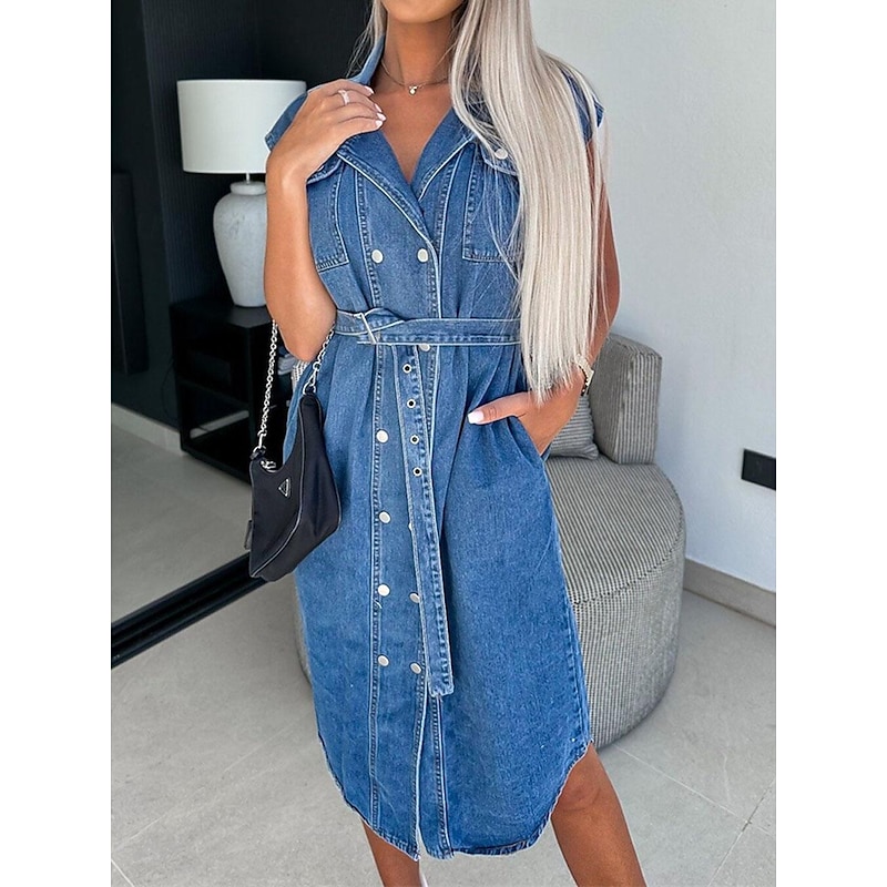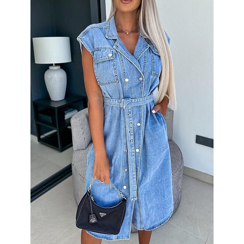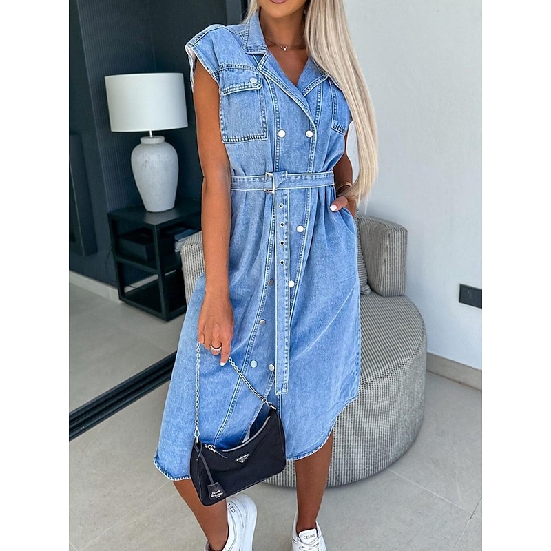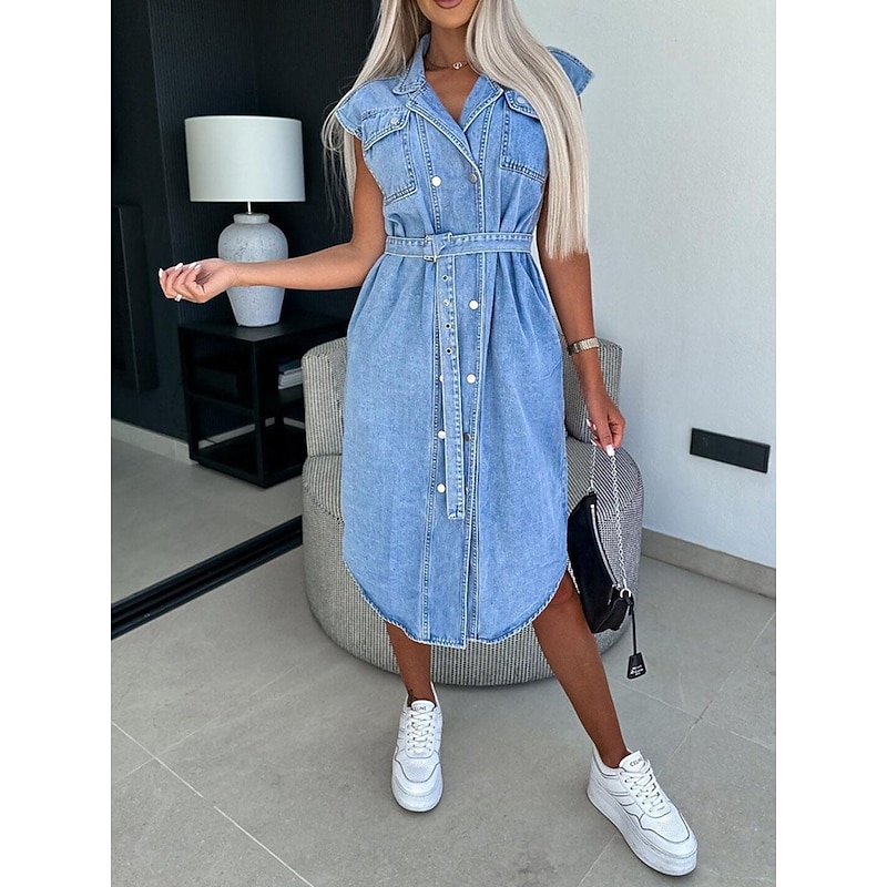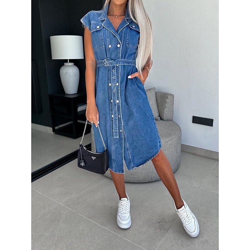 More information about Women's Denim Dress Shirt Dress Midi Dress Date Vacation Denim Basic Modern Shirt Collar Pocket Belted Short Sleeve Summer Spring Regular Fit Plain