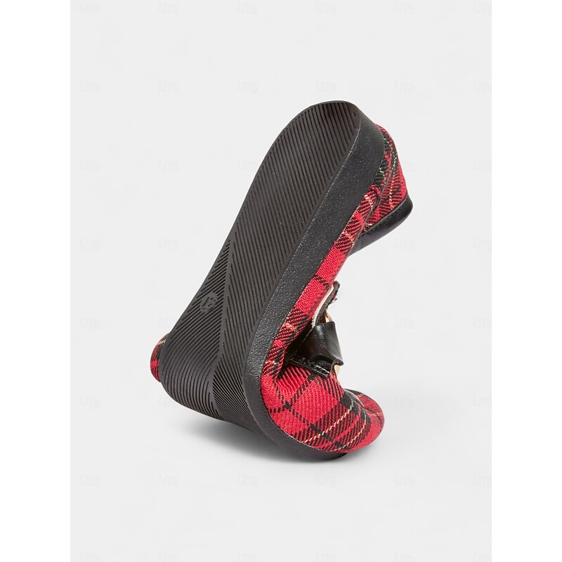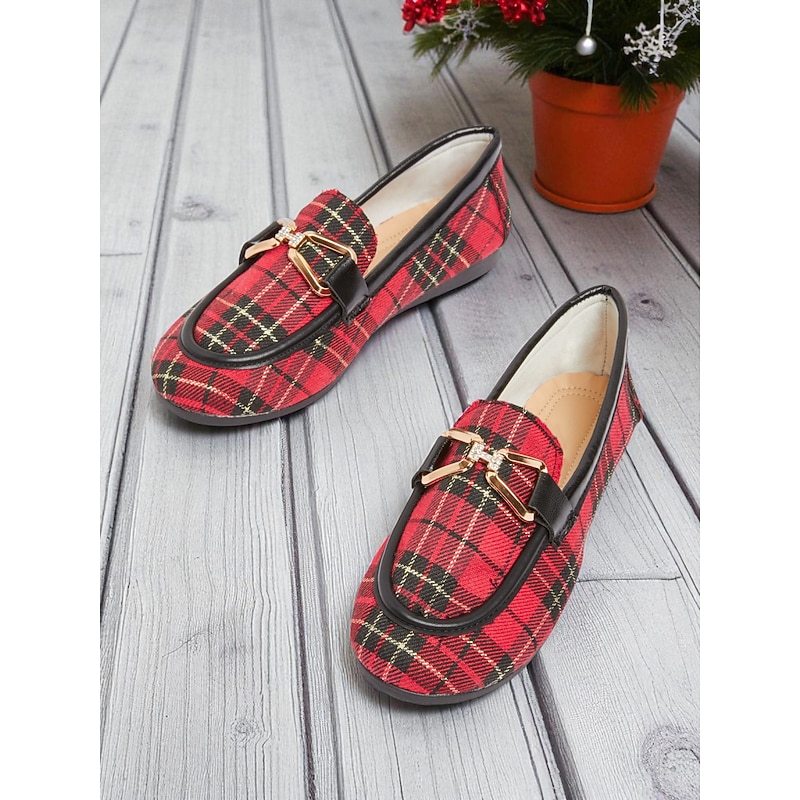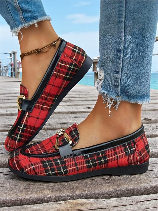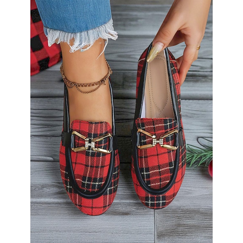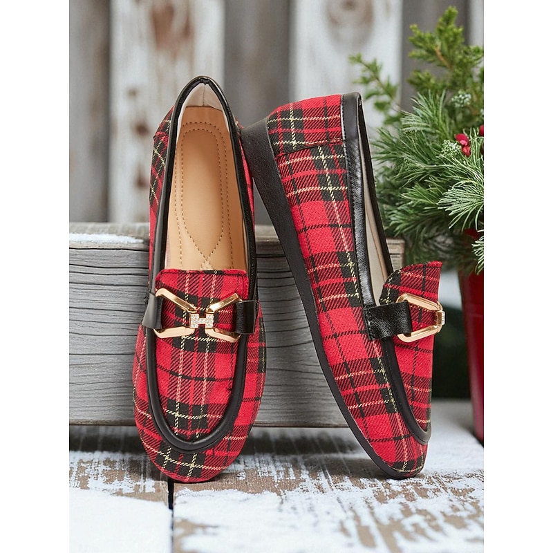 HOT ! Women's Red Plaid Loafers – Classic Checkered Slip-On Flats with Bow Accent for Christmas Parties, Work and Casual Outings