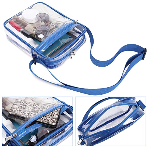 • Large Capacity: This clear stadium bag designs with a front pocket; it's convenient for packing keys, cards which means take it out easily. The main compartment is just the right size for water bottle, umbrellas, iPads, cosmetics and other daily necessities. It's lightweight and has an adjustable strap so it can be used as a shoulder bag or a cross-body bag. Works great for a concert or a game where clear bags are required.