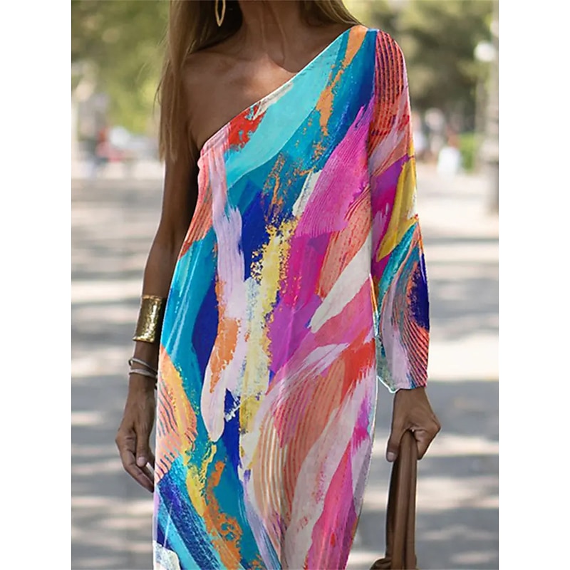 Highlights [Fabric and Fit] : Crafted from high-quality polyester, this women's maxi dress is designed to be lightweight and breathable, ensuring comfort throughout the day. The dress features a micro-elastic quality for a relaxed fit that drapes elegantly over the body, providing ease of movement in any setting. [Design Highlights] : This striking dress showcases an abstract floral and geometric print in vibrant hues like blue, orange, and army green. The one-shoulder design and asymmetrical neckline add a sophisticated twist, while the long sleeve enhances the unique flair of the piece. The flowing silhouette makes it a standout choice for those looking to make a statement with their wardrobe. [Occasions] : Perfect for a variety of occasions, this versatile dress is suited for holidays, outdoor events, casual outings, and weekend getaways. Whether you're going out for a relaxed day or attending a festive celebration, this dress adds a touch of charm and style to your look. [Size Range] : Available in sizes S, M, L, and XL, this dress is designed to accommodate a range of body types, ensuring a flattering fit for different shapes and sizes.