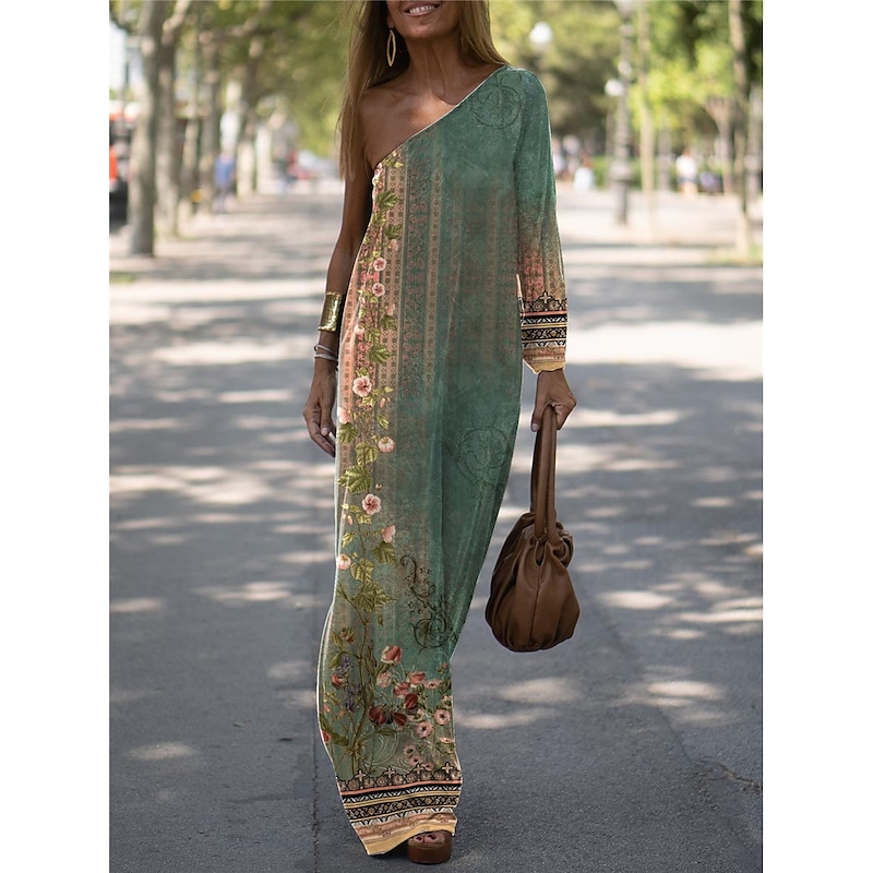 Women's Long Dress Maxi Dress Casual Dress Print Dress Floral Geometric Fashion Streetwear Outdoor Holiday Going out Print Long Sleeve One Shoulder Dress Slim ArmyGreen Blue Orange Summer Spring S M 6