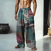 Men's Patchwork Ethnic Pants Trousers Mid Waist Drawstring Elastic Waist Hawaiian Casual Outdoor Vacation Holiday Straight Leg Trousers Summer Spring Fall 3D Print Ocean Blue Blue 1