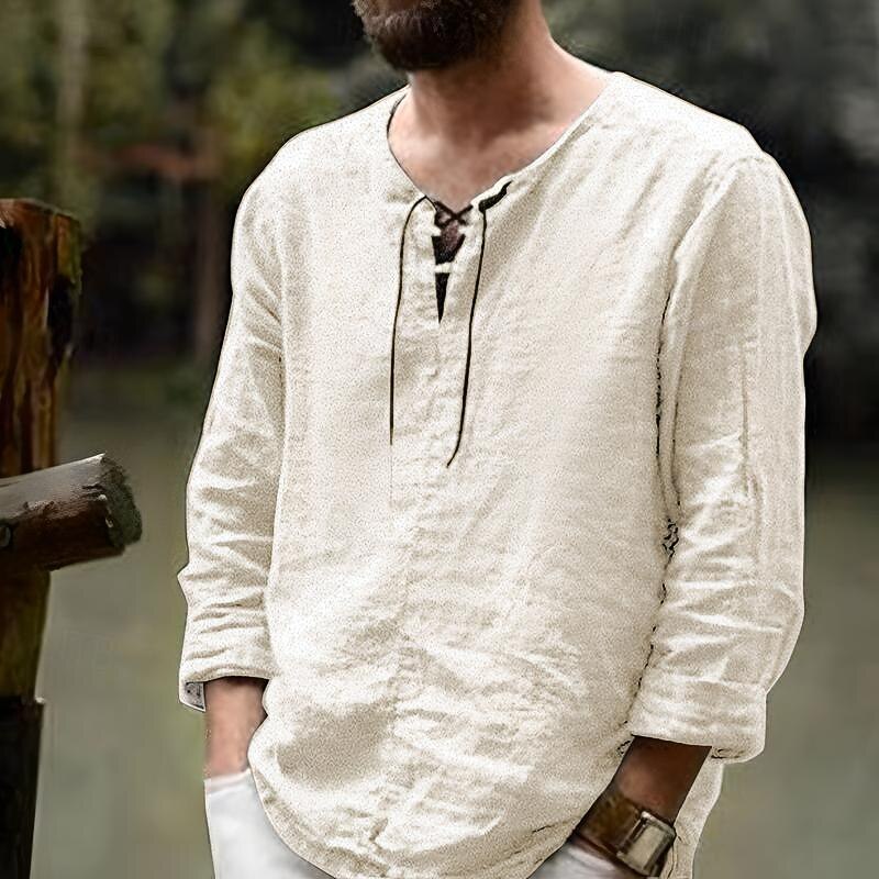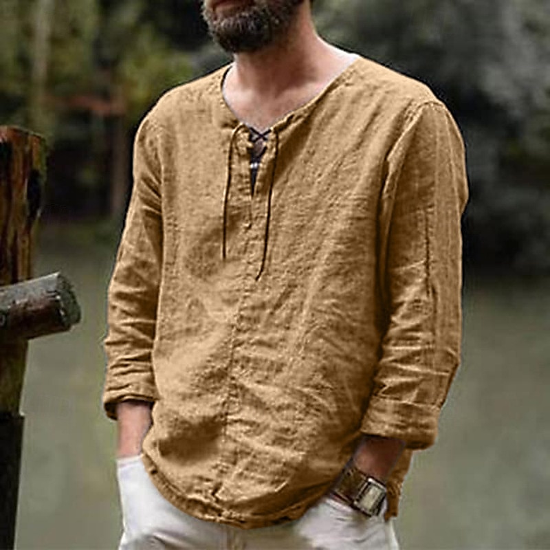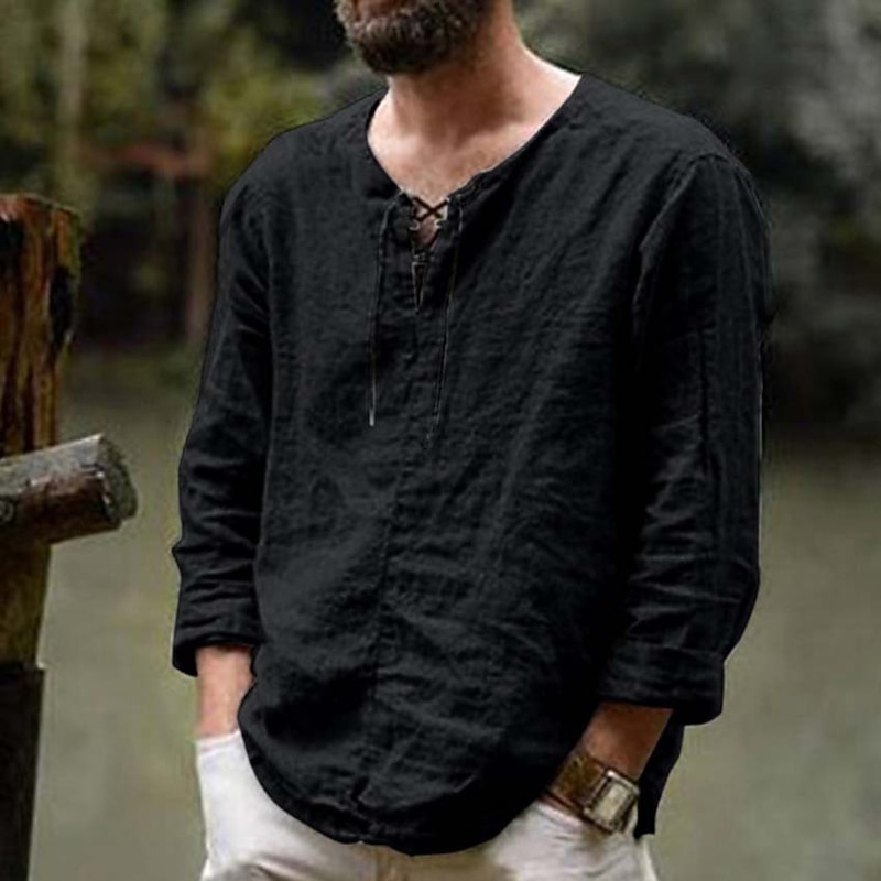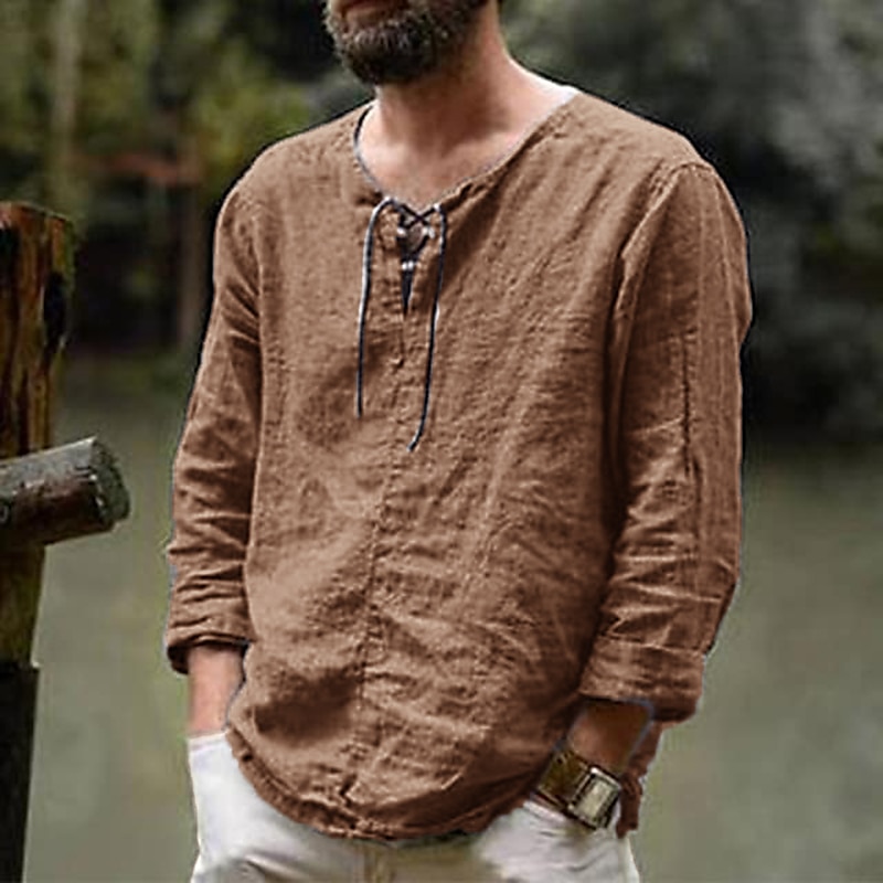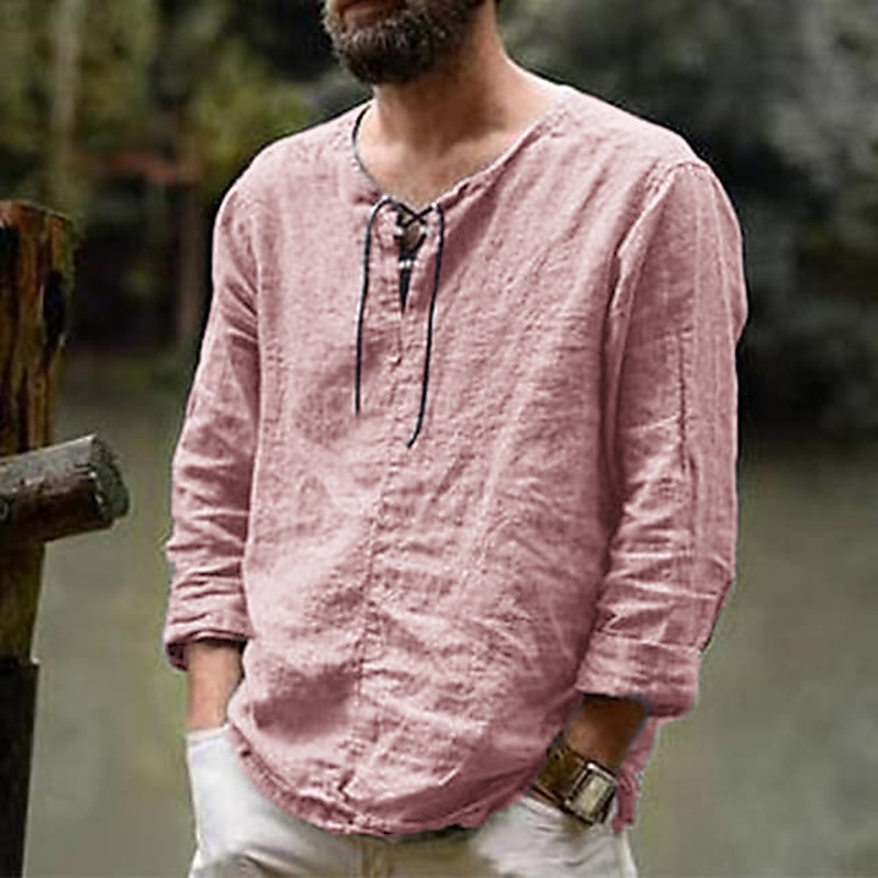 More information about Men's Linen Shirt Renaissance Festival Viking Style Summer Shirt Beach Wear Maroon Black White Pink Long Sleeve Solid Color Collarless Outdoor Street Clothing Apparel