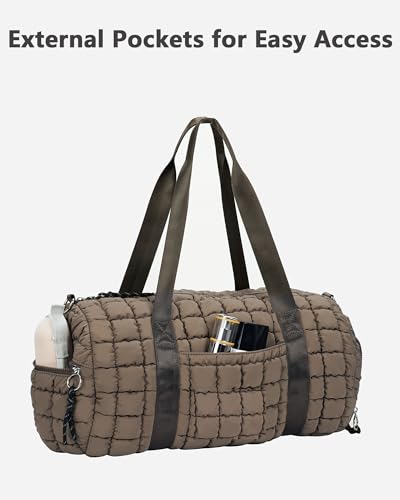 Lushandy Quilted Duffel Bag for Women, Puffer Gym Duffle Bag with Shoe Compartment Puffy Duffle Bag for Travel Overnight Carry On Bag Workout Weekend Bag, Brown 5