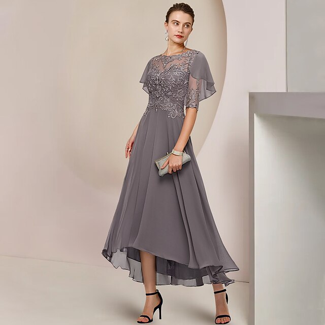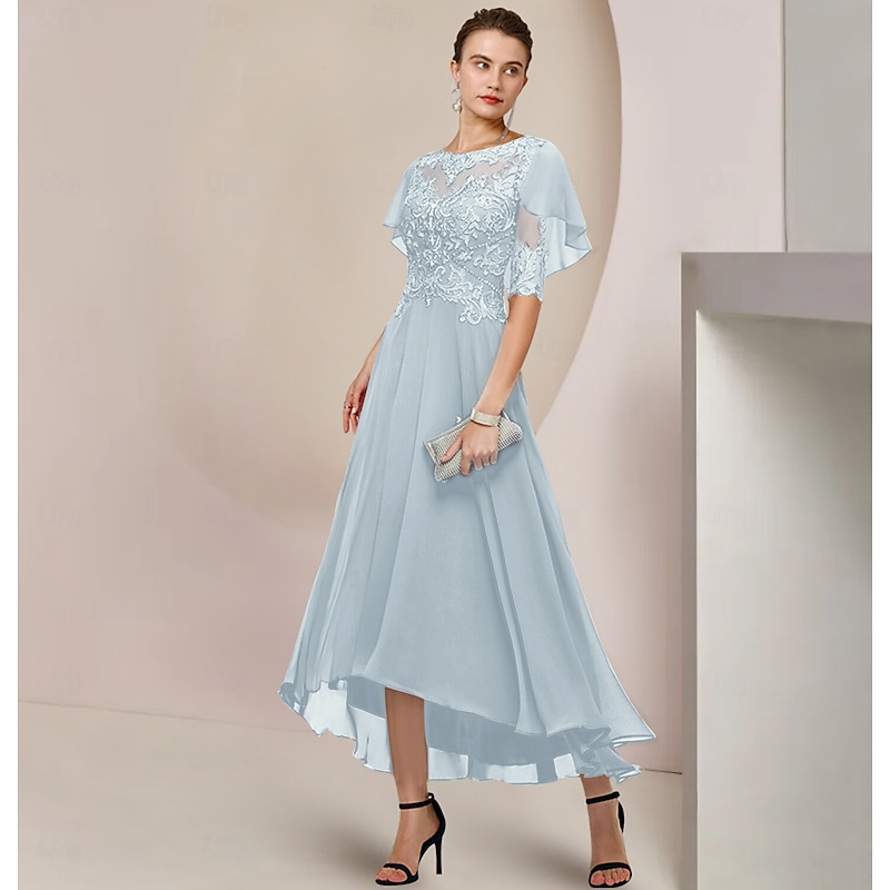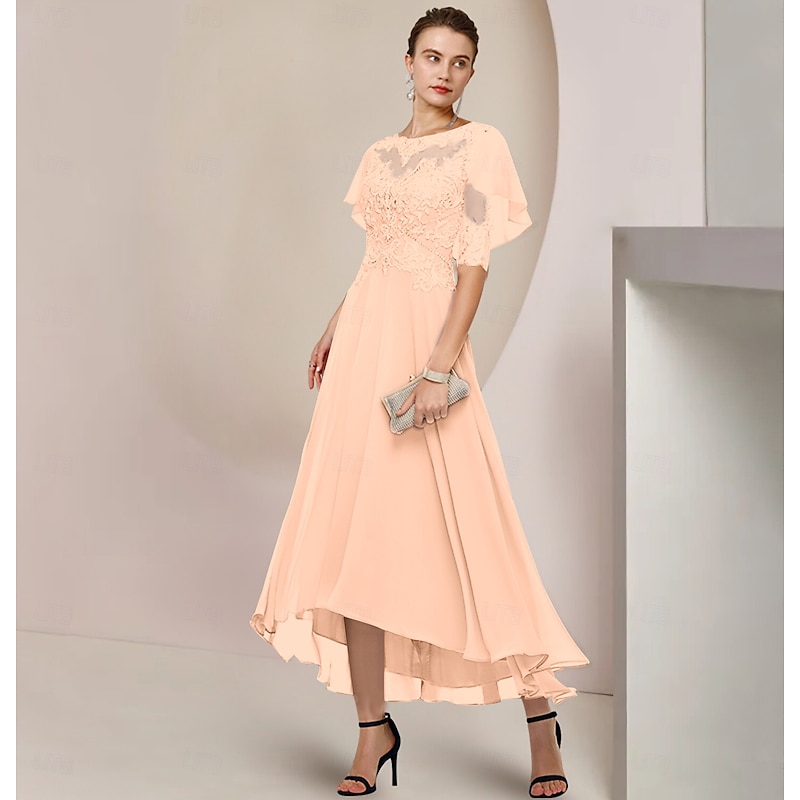 More information about A-Line Mother of the Bride Dress Formal Wedding Guest Elegant Scoop Neck Asymmetrical Tea Length Chiffon Lace Half Sleeve with Beading Appliques