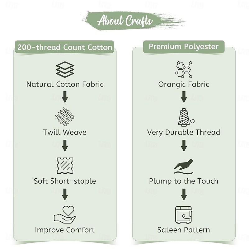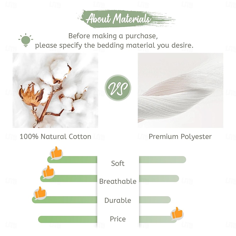 Highlights We offer two Fabric Options-- Option 1:Made from 100% natural cotton , features soft, breathable and lightweight.High-density weave with 200-thread count ,will get MORE COMFORTABLE AND DURABLE.The cotton duvet cover set is suitable for all seasons to provide the premium sleeping experience for your family. Option 2: Crafted from 100% premium polyester microfiber fabric with double-brushed process,ULTRA SOFT,BREATHABLE,SKIN FRIENDLY,wrinkle and fade resistance.For households or other places that frequently change duvet covers, polyester is a more cost-effective choice. Note: It is recommended to wash 1-2 times after receiving it, the fabric will become softer and more skin-friendly.