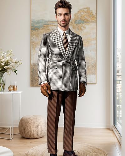 More information about Men's Herringbone Tweed Blazer Coat Slim Fit Double Breasted Suit Jacket with Belt