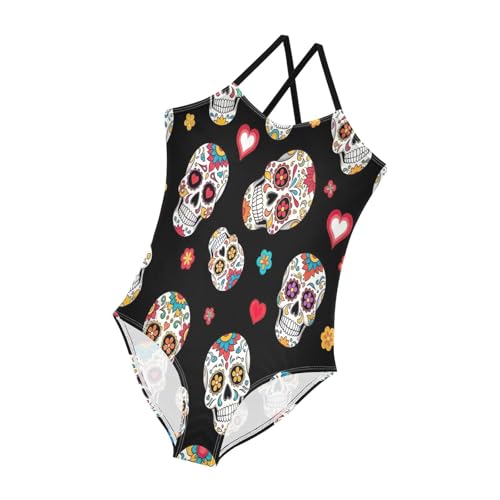 Colorful Skulls Floral Girl Swimsuit One Piece, Summer Beach Bathing Suit, 3-10 5