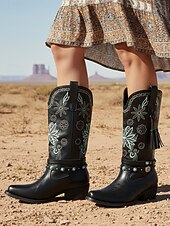 More information about Women's Black Cowboy Boots with Floral Embroidery and Tassel Details -Bohemian Western Style with Studded Strap, Perfect for Casual Wear and Festivals