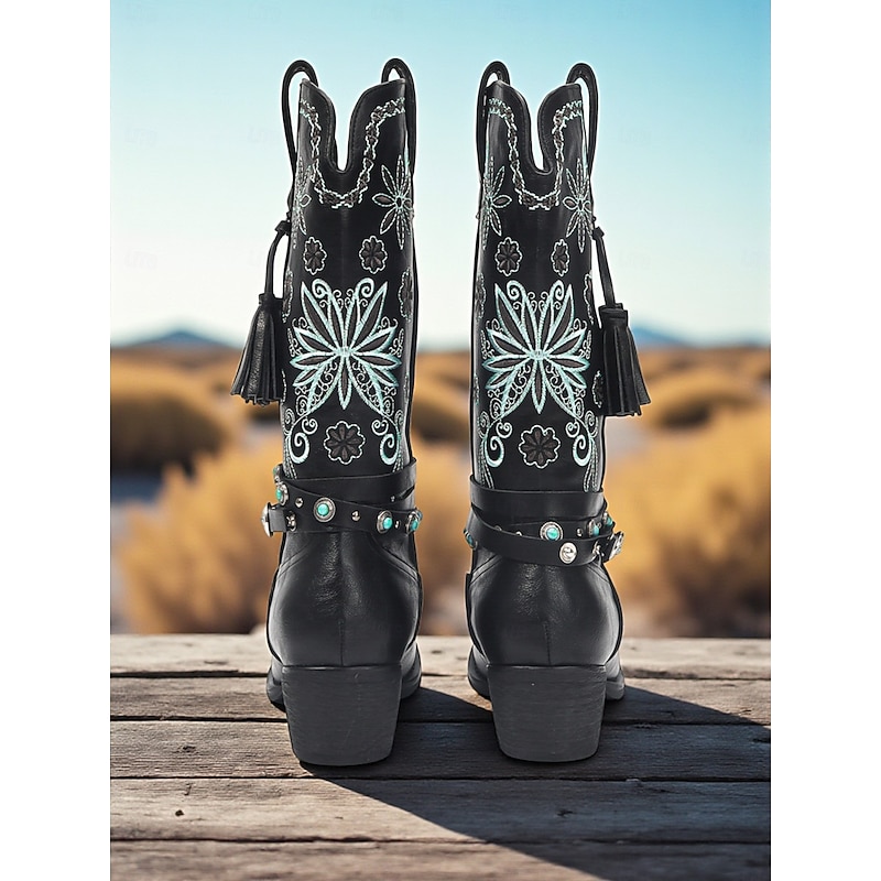Women's Black Cowboy Boots with Floral Embroidery and Tassel Details -Bohemian Western Style with Studded Strap, Perfect for Casual Wear and Festivals 5