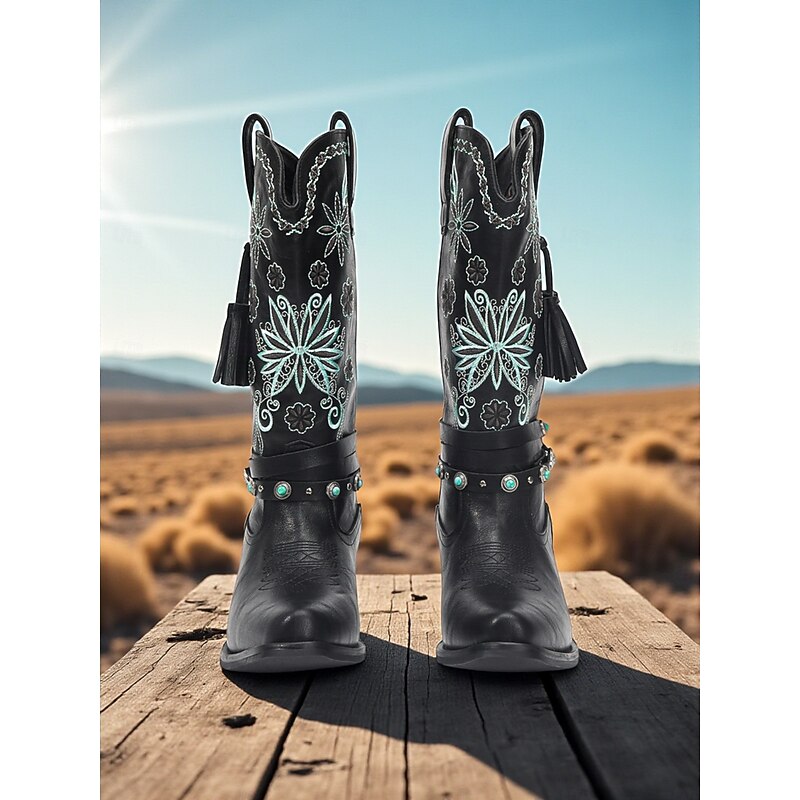 Women's Black Cowboy Boots with Floral Embroidery and Tassel Details -Bohemian Western Style with Studded Strap, Perfect for Casual Wear and Festivals 1