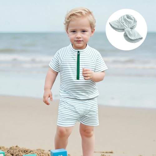 • Feature: Toddler bathing suits for boys: Tops: Short sleeve, round neck, striped print, front zipper with safety tab, easy to put on and take off. Comes with a pair of elastic waist shorts and a sun hat.High quality, stretchy,quickly drying fabric. Soft and comfortable baby boy swimsuit