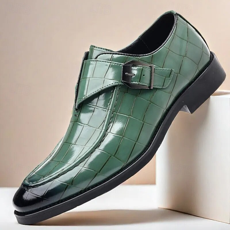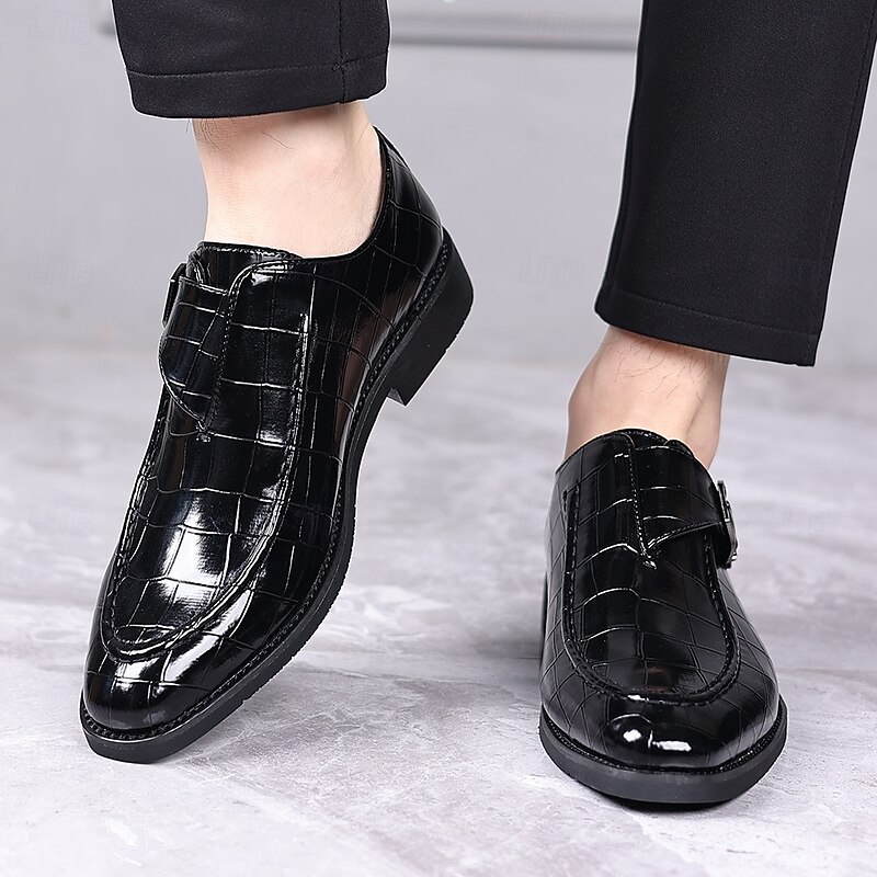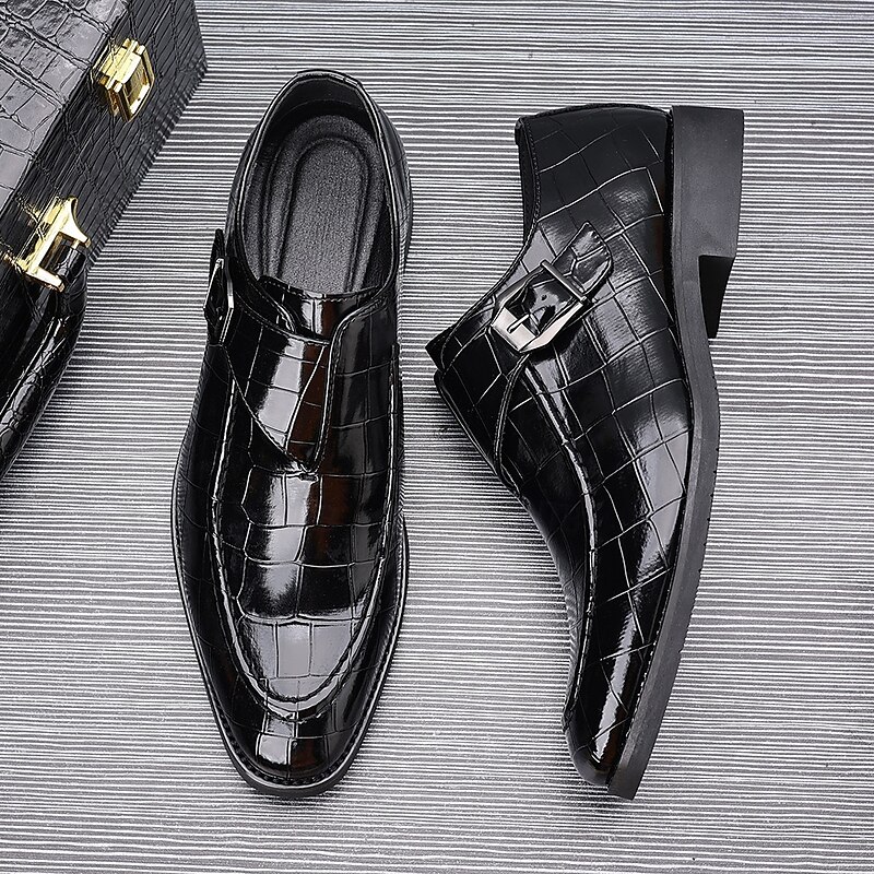 HOT ! Men's Burgundy Crocodile Pattern Faux Leather Dress Shoes with Buckle, Elegant Footwear for Formal & Business Occasions