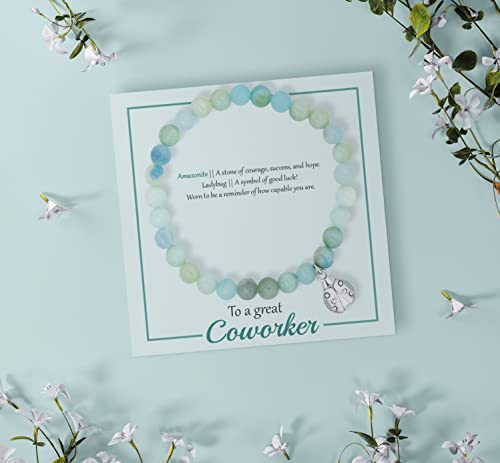 • THE MEANING: Throughout history, Amazonite has been worn to promote courage, success, and hope. The cute ladybug charm is seen as a symbol of good luck throughout the world. By wearing this bracelet, let it remind her of the unforgettable times she shared with her coworkers.