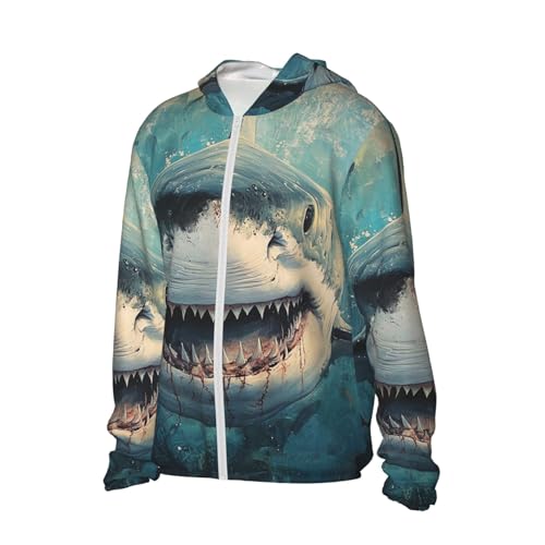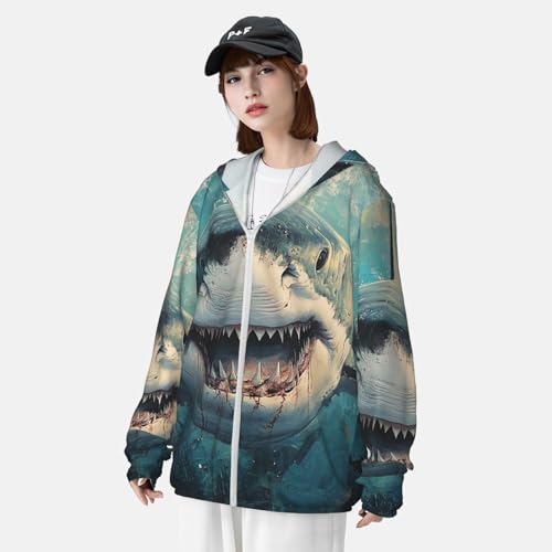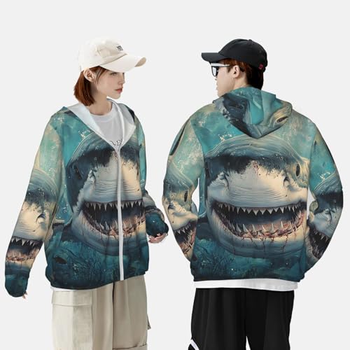 Fabric type: 100% PolyesterClosure type: ZipperNeck style: Hooded NeckSleeve type: Long SleeveBreathable & Quick-Dry: Our summer long sleeve Ocean Shark sun protection shirts are made from quick-dry and breathable elastic material that dries quickly. It breathes easily to vent excess heat and moisture to keep you cool, dry, and moving comfortably.UV Protection: Our Ocean Shark long sleeve sun shirts features cutting-edge UPF 50+ technology, effectively blocking UV rays to ensure robust sun protection during your outdoor adventures. Designed with a hood to protect the neck, and other sun-exposed areas. Ideal for extended outdoor activitiesLightweight & Comfort: The ultralight Ocean Shark fishing shirt is designed for a natural fit, the ultralight fabric and ergonomic flat-lock seam construction reduce chafing. Our fishing shirts moves effortlessly with your body, ensuring all-day comfort.Designed for Outdoor Sports: Whether you're fishing, hiking, running, swimming, rash guard, or simply enjoying the beauty of nature, our sunproof hoodie is the superb companion for all your activities; Seamlessly blending style with protection, it meets your outdoor adventure needs with perfection.Versatile Style: This men's sun protection shirt has a simple and elegant design, which is not only suitable for matching with swimsuits and sportswear, but also can match up with a variety of pants and shoes. Now you can choose a special sun protection clothing for your family, friends or yourself to protect the skin and show your fashion sense at the same time.