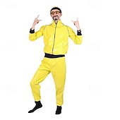 Highlights [Title] : Rapper Carnival Costume - Men's Cosplay Party/Evening Wear for Carnival and Mardi Gras [Fabric] : Crafted from high-quality polyester, this costume boasts a shiny, synthetic finish that provides both comfort and a subtle sheen, allowing easy mobility with its micro-elastic properties. [Fit] : The ensemble offers a sporty, retro fit consisting of a jacket and pants set. The elasticated waistband ensures ease of wear and adaptability to various body types, providing a comfortable yet secure fit. [Design Highlights] : The jacket features a zip-up front adorned with bold black accents along the zipper, cuffs, and hem, offering a sleek contrast against the vibrant yellow fabric. The ensemble is completed with matching pants and a stylish hat, making it a standout choice for any themed event. [Occasions] : Perfect for themed parties, evening gatherings, Carnival, and Mardi Gras events. This costume is an excellent choice for those looking to make a bold statement or embrace their inner rapper persona at any festive occasion. [Size Range] : Available in sizes S, M, L, XL, and XXL, ensuring a suitable fit for a wide range of body types, making it accessible to many adults.