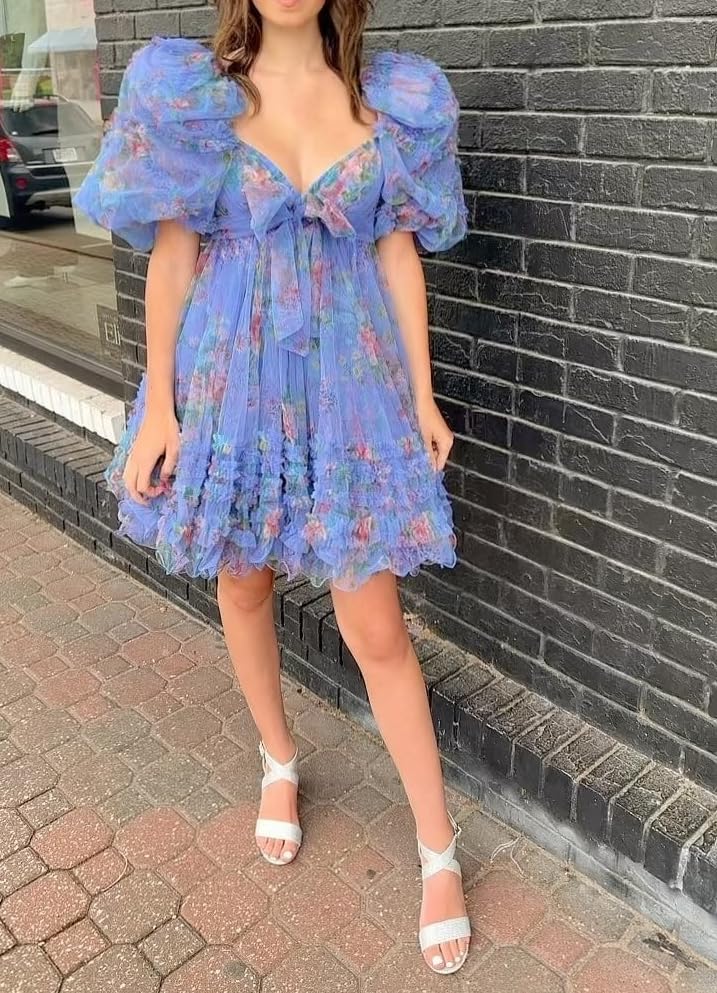 ALFEICE Puffy Sleeves Tulle Homecoming Dresses for Teens Tiered A Line Short Prom Dresses Printed Cocktail Formal Party Gwons 1