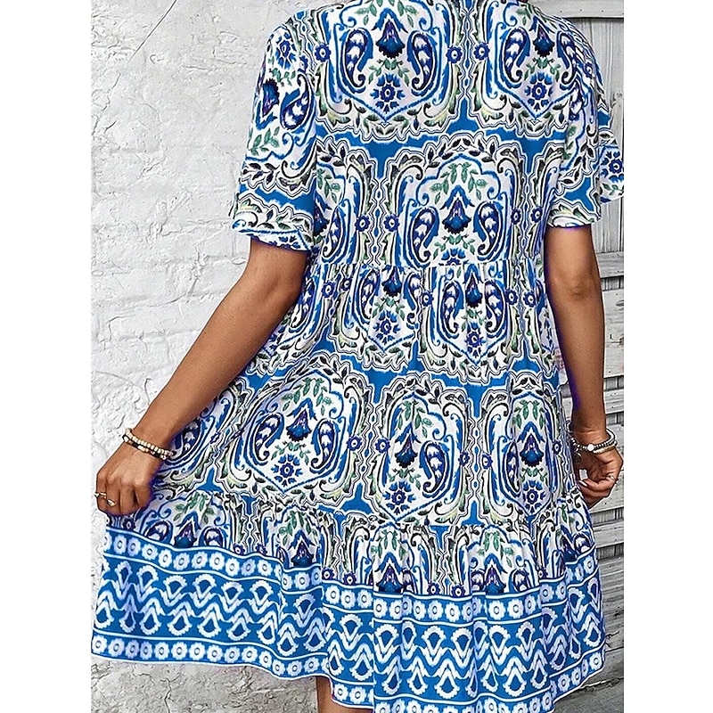 Highlights [Fabric] : Crafted from lightweight and breathable polyester, this dress is perfect for keeping cool during the warmer months. The material ensures comfort and incorporates a delightful bohemian charm. [Fit] : Designed with a relaxed, flowy fit that offers a slightly flared silhouette, this mini dress falls elegantly above the knees. It provides a loose and comfortable wear suitable for various summer activities. [Design Highlights] : Featuring a vibrant floral print, this dress includes intricate bohemian patterns. A deep V-neckline gives a touch of allure, while the short, wide sleeves ensure ease of movement, adding to the dress's easygoing style. [Occasions] : Ideal for vacations, daily outings, or beach getaways, this dress is a versatile addition to your summer wardrobe. Whether you're enjoying a peaceful day at the beach or a casual stroll in the park, it perfectly captures a chic, laid-back vibe. [Size] : Available in sizes S, M, L, and XL, this dress accommodates a range of body types, ensuring a flattering fit for every occasion.