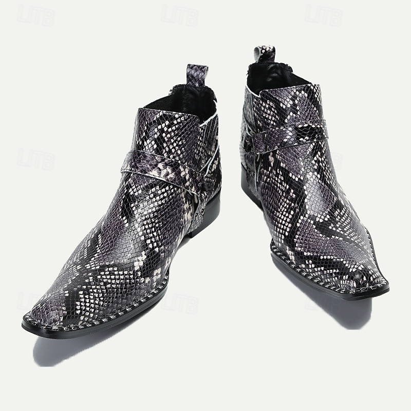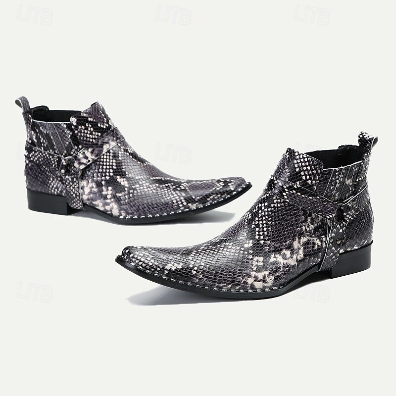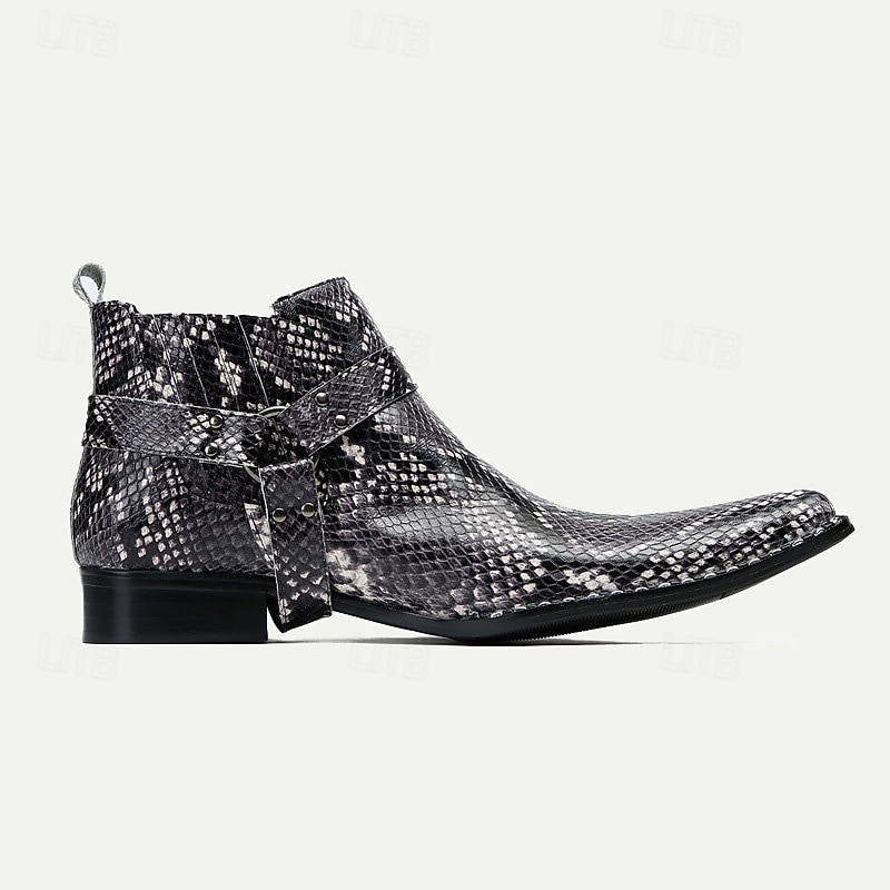 Highlights [Fabric and Material] : Expertly crafted from 100% Italian full-grain cowhide leather, these men's ankle boots offer a premium, durable construction with a luxurious feel. Featuring a unique snakeskin pattern, they combine timeless elegance with a modern twist. [Style and Fit] : These boots boast a sleek, rounded toe design and a mid-ankle height that delivers a contemporary yet edgy appearance. Their mid-ankle length is ideal for providing both comfort and style, ensuring they pair well with a variety of outfits for versatile wear. [Design Highlights] : The boots are adorned with a distinctive metallic toe embellishment and side straps featuring metal rivet details, enhancing their rugged, sophisticated aesthetic. The robust rubber outsole is designed for slip resistance and long-lasting wear, making these shoes not only stylish but also practical for everyday use. [Occasions] : Perfect for biker events, casual outings, and any occasion where you want to make a bold fashion statement, these boots are versatile enough for both casual and semi-formal settings. Whether you're dressing up for a night out or going about your day, they seamlessly blend function and flair. [Size Range] : Available in a range of sizes from US6 / EU39 to US13 / EU46, these boots cater to a variety of foot sizes to ensure a perfect fit for every wearer.