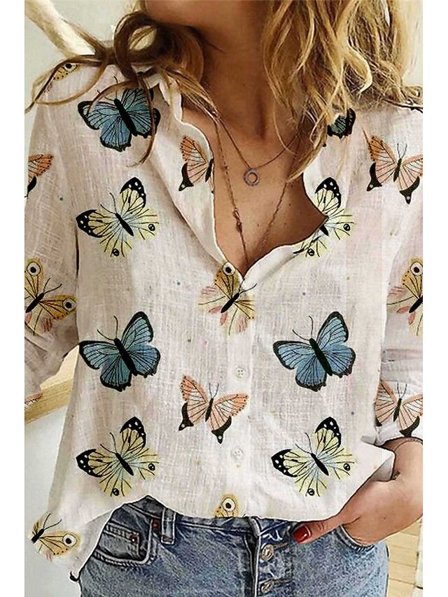 More information about Women's Shirt Blouse Butterfly Flower Modern Casual Long Sleeve Shirt Collar Regular Tops Holiday Going out Buttons Print White Blue Khaki Beige Light Blue Summer