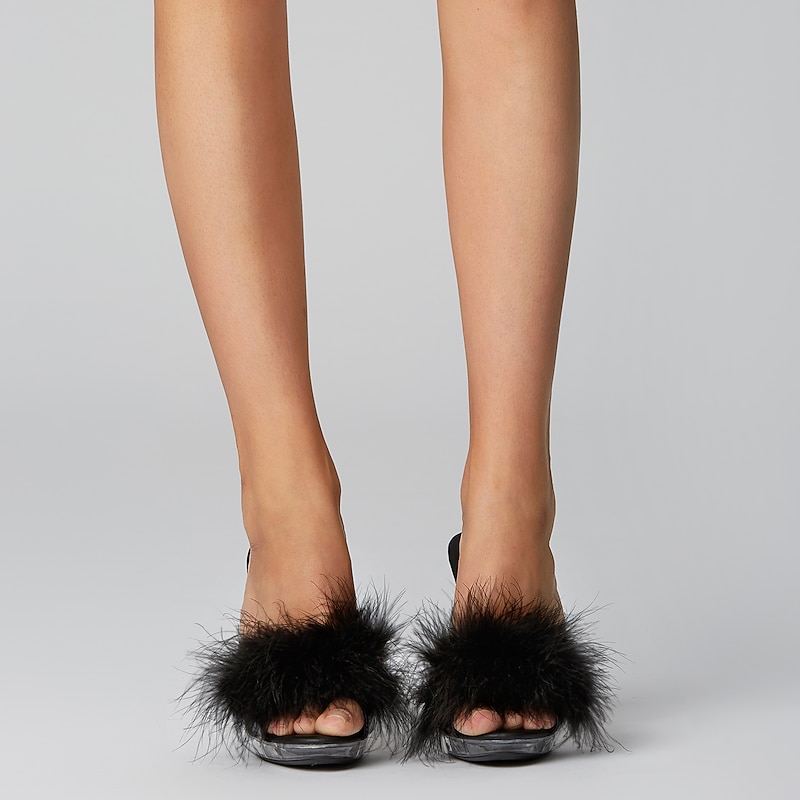 These stylish high-heeled mules feature an upper made from luxurious patent leather, complemented by plush, fluffy faux feathers for a touch of elegance and glamour. The use of premium materials ensures a durable and sophisticated look, perfect for making a statement.