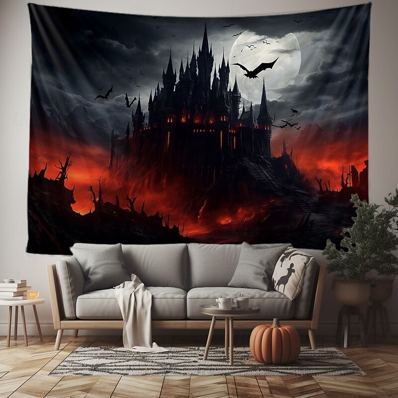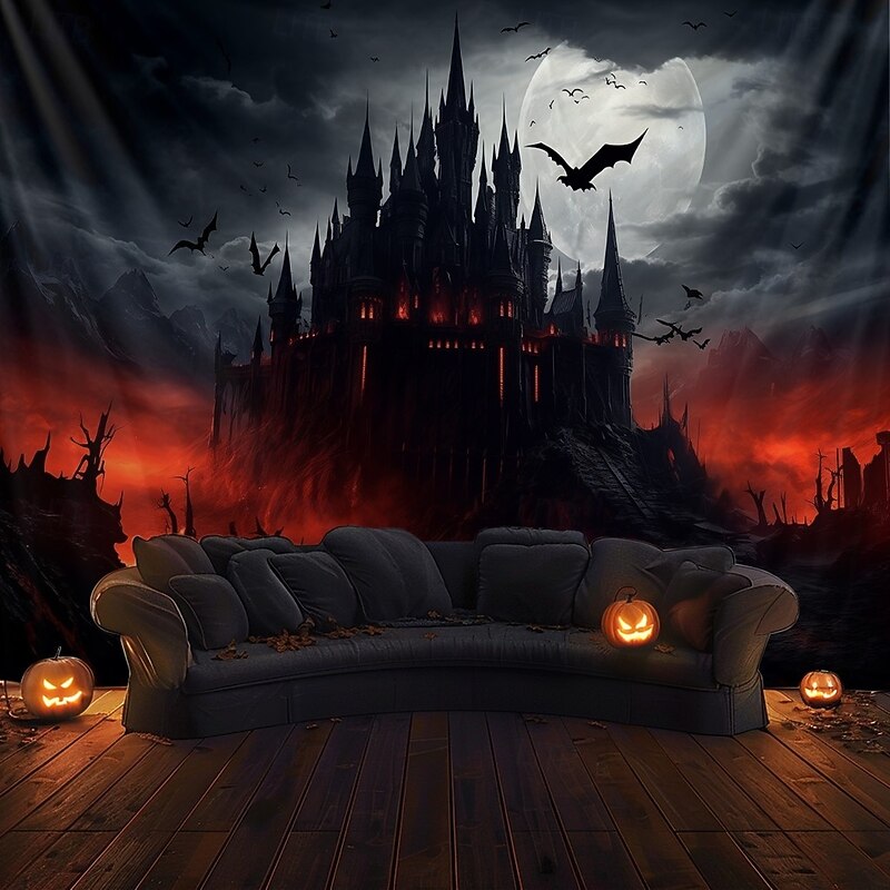 Halloween Gothic Castle Wall Tapestry – Spooky Night Scene with Pumpkins and Bats, Horror Haunted Castle Backdrop for 2025 HALLOWEEN Living Room, Bedroom, Party Decoration 22
