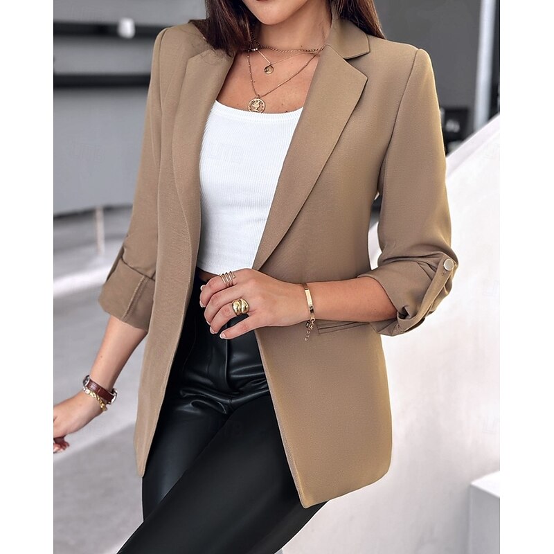 Highlights [Fabric] : This women's blazer is crafted from high-quality polyester, offering a smooth and professional look ideal for fall and winter. The material ensures durability and comfort, making it perfect for daily wear. [Fit] : With its regular fit design, this blazer elegantly frames the body, providing a sophisticated appearance suitable for various occasions. The long sleeves and notched lapel contribute to its timeless style. [Design Highlights] : Featuring a single-breasted front and button detailing, this blazer adds a classic touch to any outfit. The adjustable three-quarter sleeves with buttoned tabs offer versatility, while the pockets enhance its functionality. [Occasions] : This blazer is perfect for formal settings, office environments, or casual outings. Its sleek design allows for effortless pairing with various tops, making it a versatile addition to any wardrobe. [Size] : Available in a range of sizes from S to XXL, this blazer caters to a variety of body shapes, ensuring a comfortable fit for everyone.