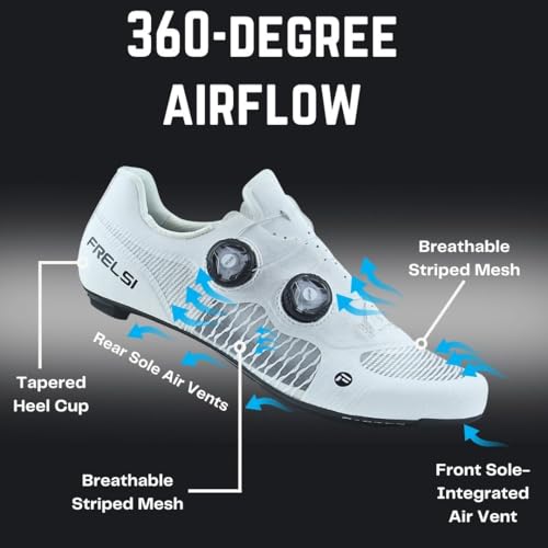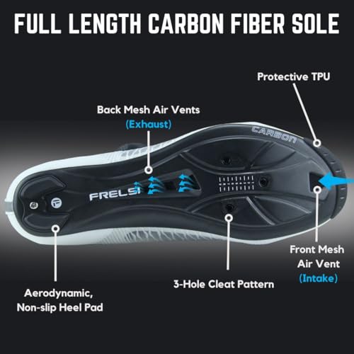 • INNOVATIVE VENTILATION: 360-degree ventilation system keeps your feet cool and dry, with strategically placed vents in the carbon fiber sole and breathable mesh on the sides and front.