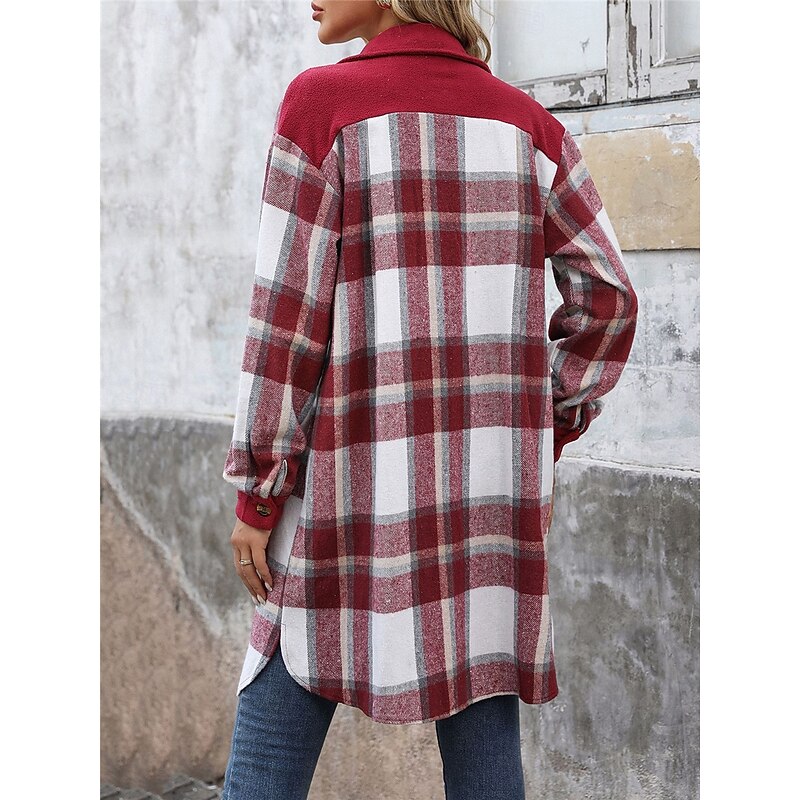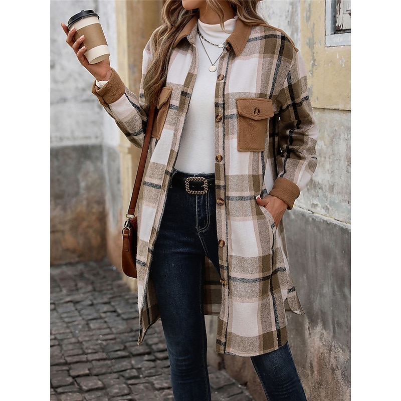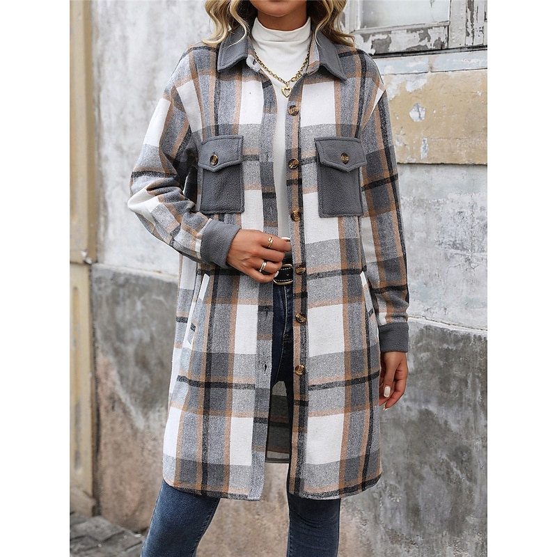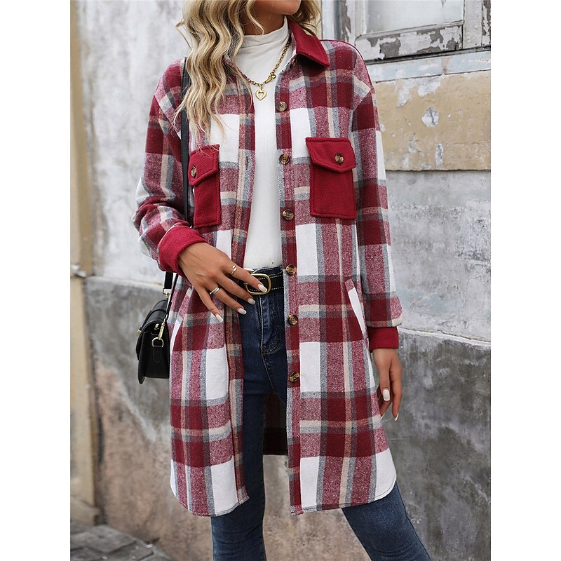 More information about Women's Winter Coat Outdoor Street Daily Wear Fall Winter Long Coat Regular Fit Thermal Warm Breathable Stylish Casual Jacket Long Sleeve Stripes and Plaid with Pockets Print Wine Coffee Gray