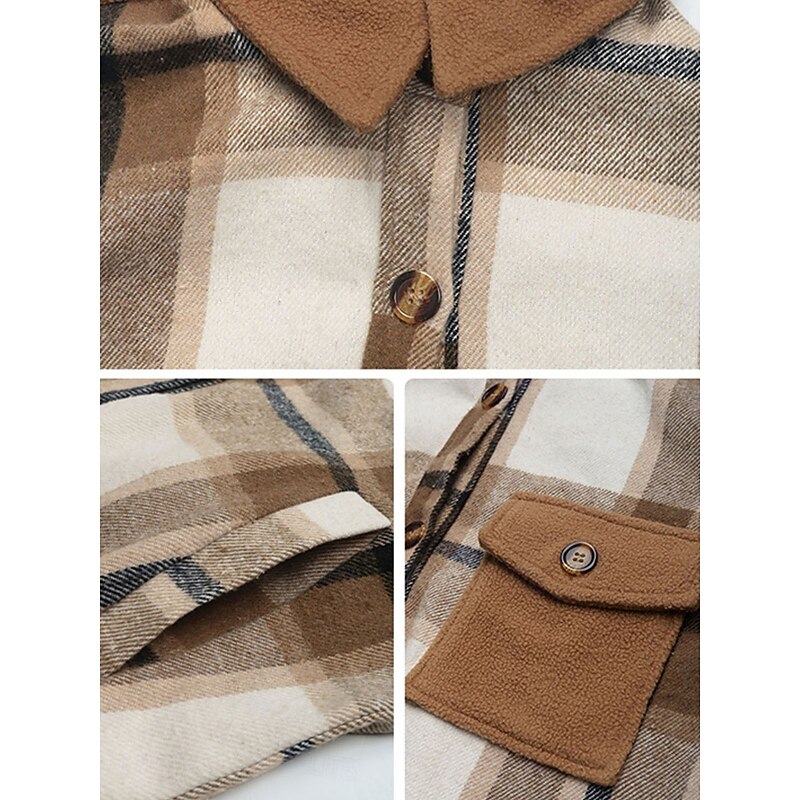 : Featuring a classic stripes and plaid pattern, this coat comes with a stylish turndown neckline and a single-breasted placket. The long sleeves are complemented by solid-colored cuffs that contrast beautifully with the plaid design. Practicality is ensured with two front flap pockets with button closures, adding both style and storage.