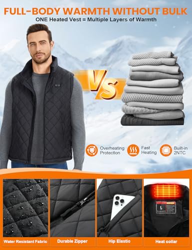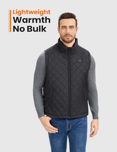 • STYLISH & FUNCTIONAL DESIGN – WARMTH WITHOUT BULK: Slim, water-resistant outer shell and soft lining give you the look of a fashion-forward warmth vest without added weight. Discreet pockets, reinforced stitching, and a sleek silhouette make this heated vest men love equally at the office or on the trails. Layer it under a jacket or wear it solo for versatile, lightweight warmth.