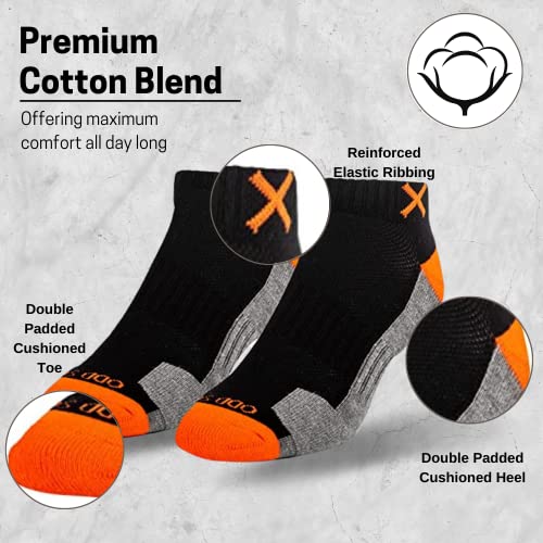 • Breathable ankle-length athletic socks in Orange Black Heather, with our performance cross knit technology offers medium cushion and compression throughout; The dynamic arch support zone alleviate foot fatigue; Ankle High Sport Socks; Dry moisture wicking; Anti-odor
