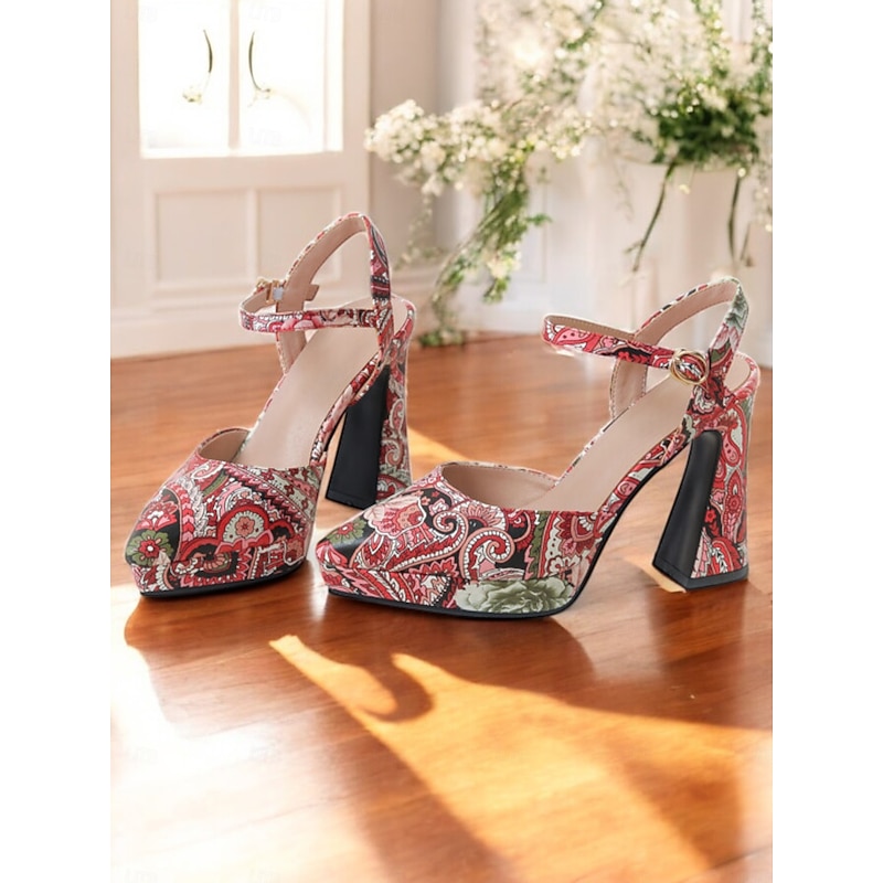 HOT ! Red Paisley Patterned High Heel Sandals for Women – Vintage Chic Open Toe with Block Heels – Perfect for Parties and Special Occasions