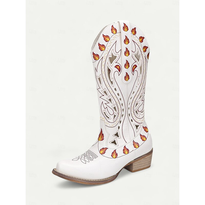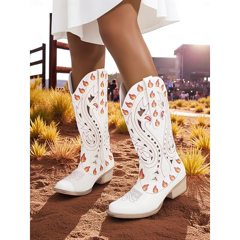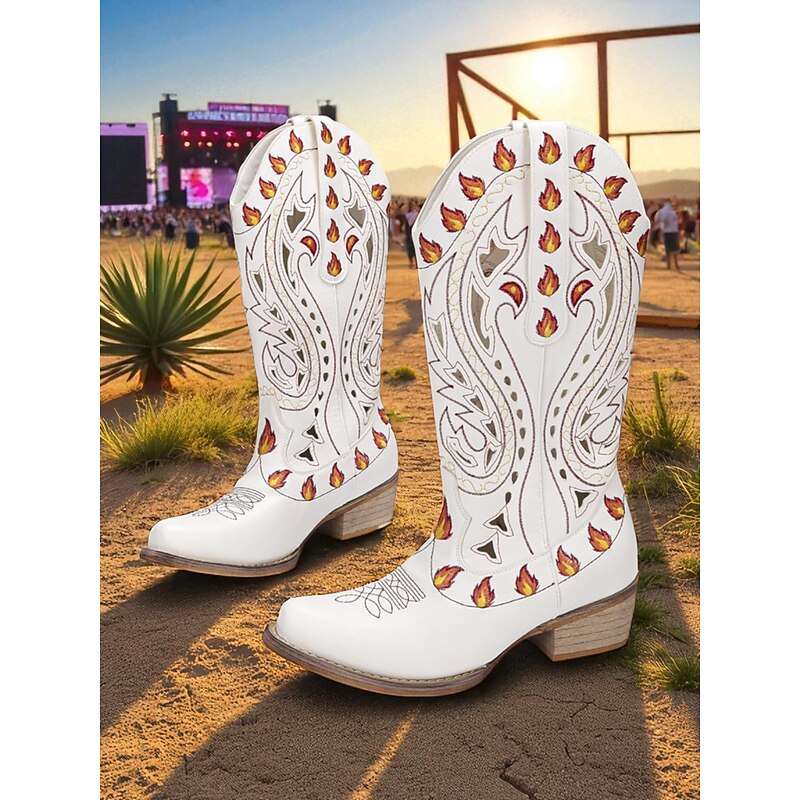 HOT ! Women's Black Flame Embroidered Western Cowboy Boots - Retro Knee-High Festival Boots with Low Heel for Music Festivals, Halloween Costume, and Cosplay