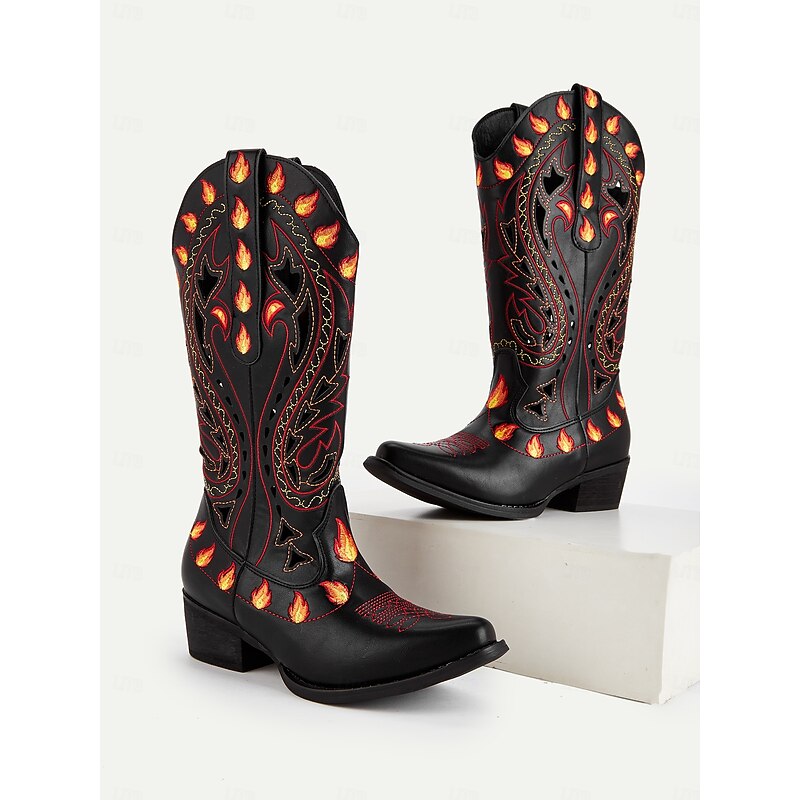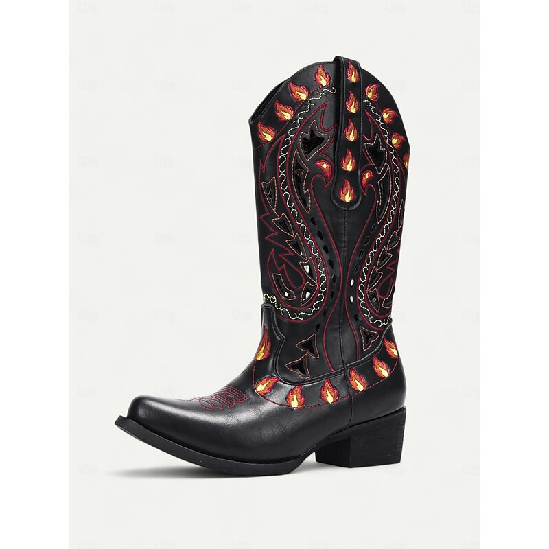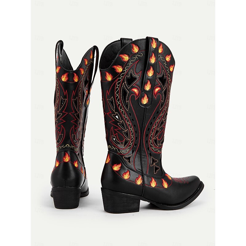 Women's Black Flame Embroidered Western Cowboy Boots - Retro Knee-High Festival Boots with Low Heel for Music Festivals, Halloween Costume, and Cosplay 1