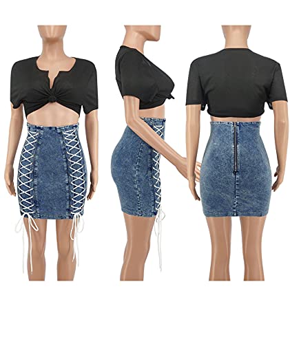 SEMATOMALA Women's String Criss Cross Lace Up Denim Jeans Skirt Bodycon High Waist Stretchy Back Zipper Pencil Clubwear 6