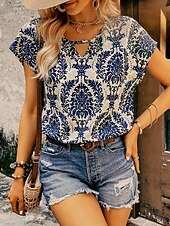 HOT ! Women's T Shirt Floral Vintage Ethnic Short Sleeve Crew Neck Regular Tops Daily Print Blue Summer