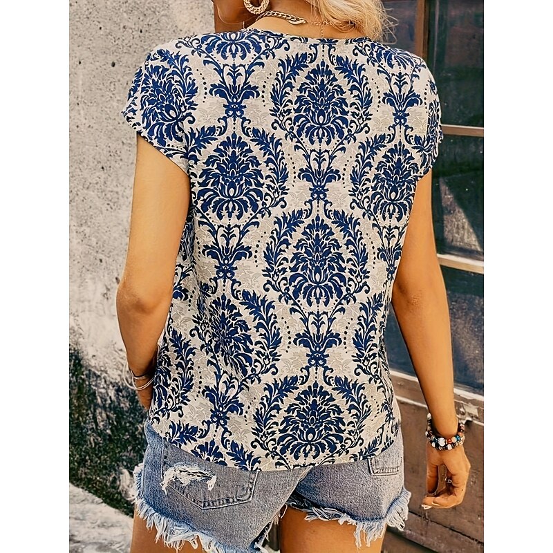 Women's T Shirt Floral Vintage Ethnic Short Sleeve Crew Neck Regular Tops Daily Print Blue Summer 2