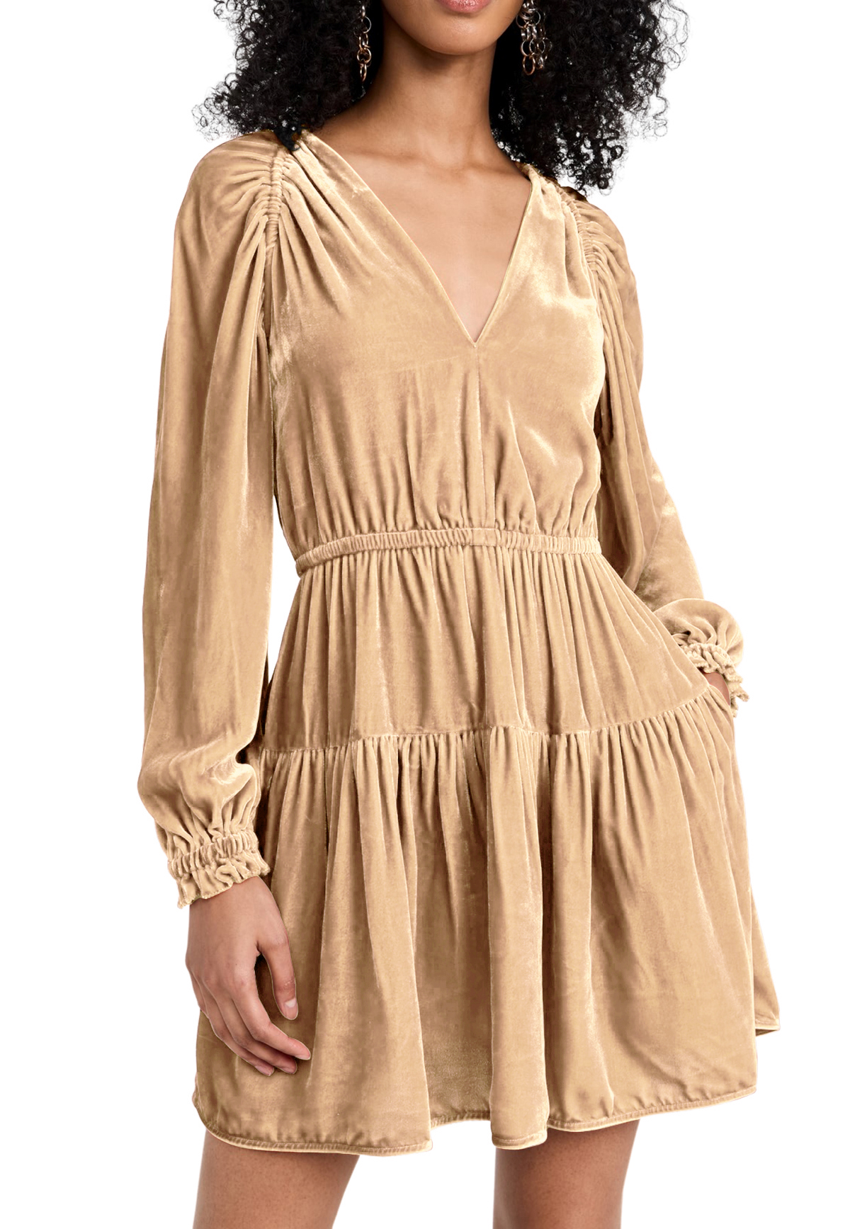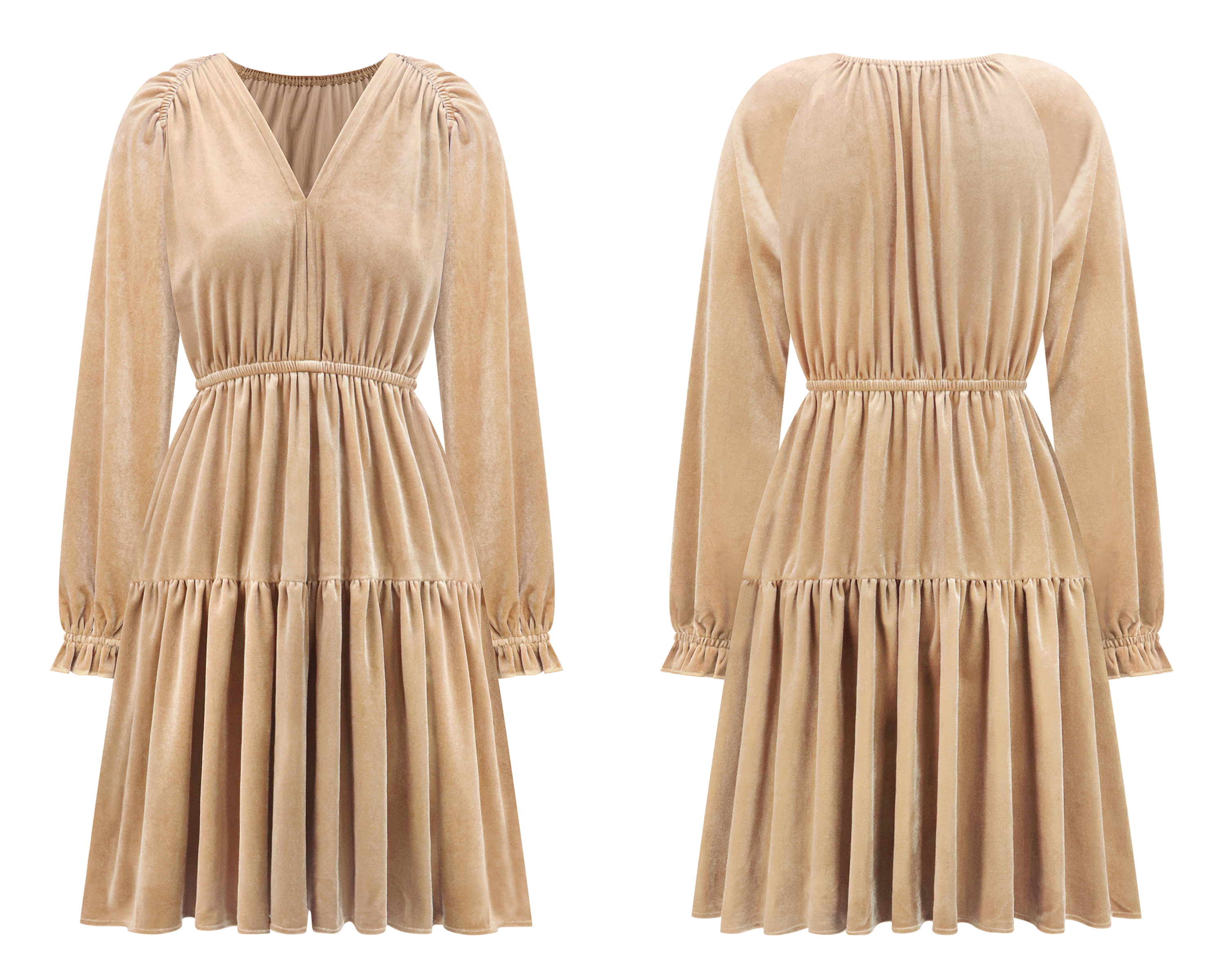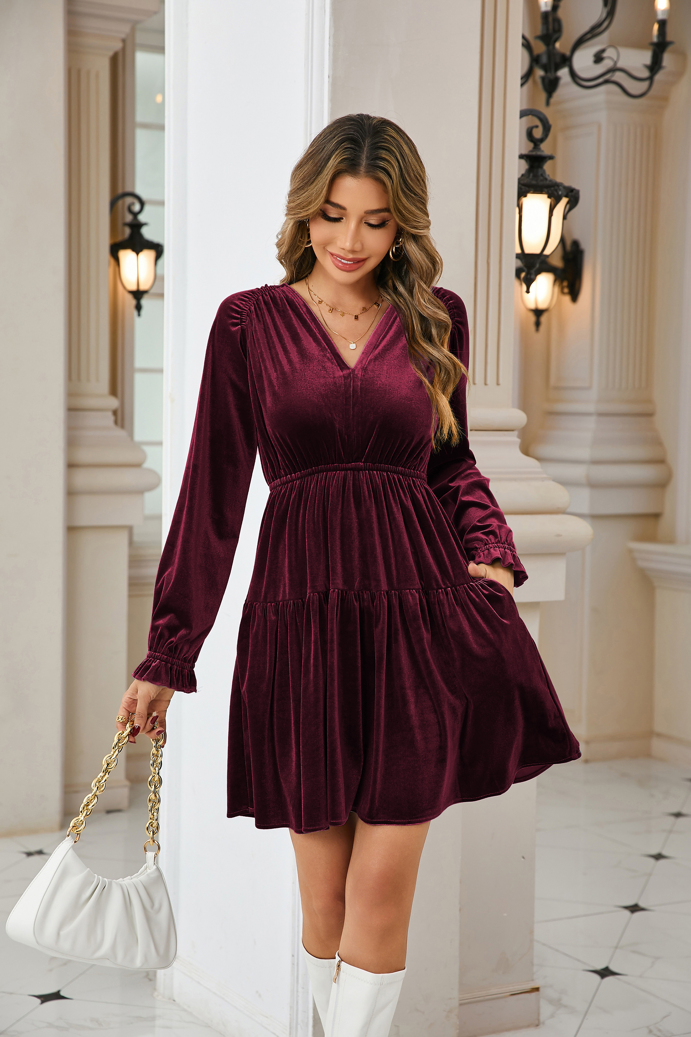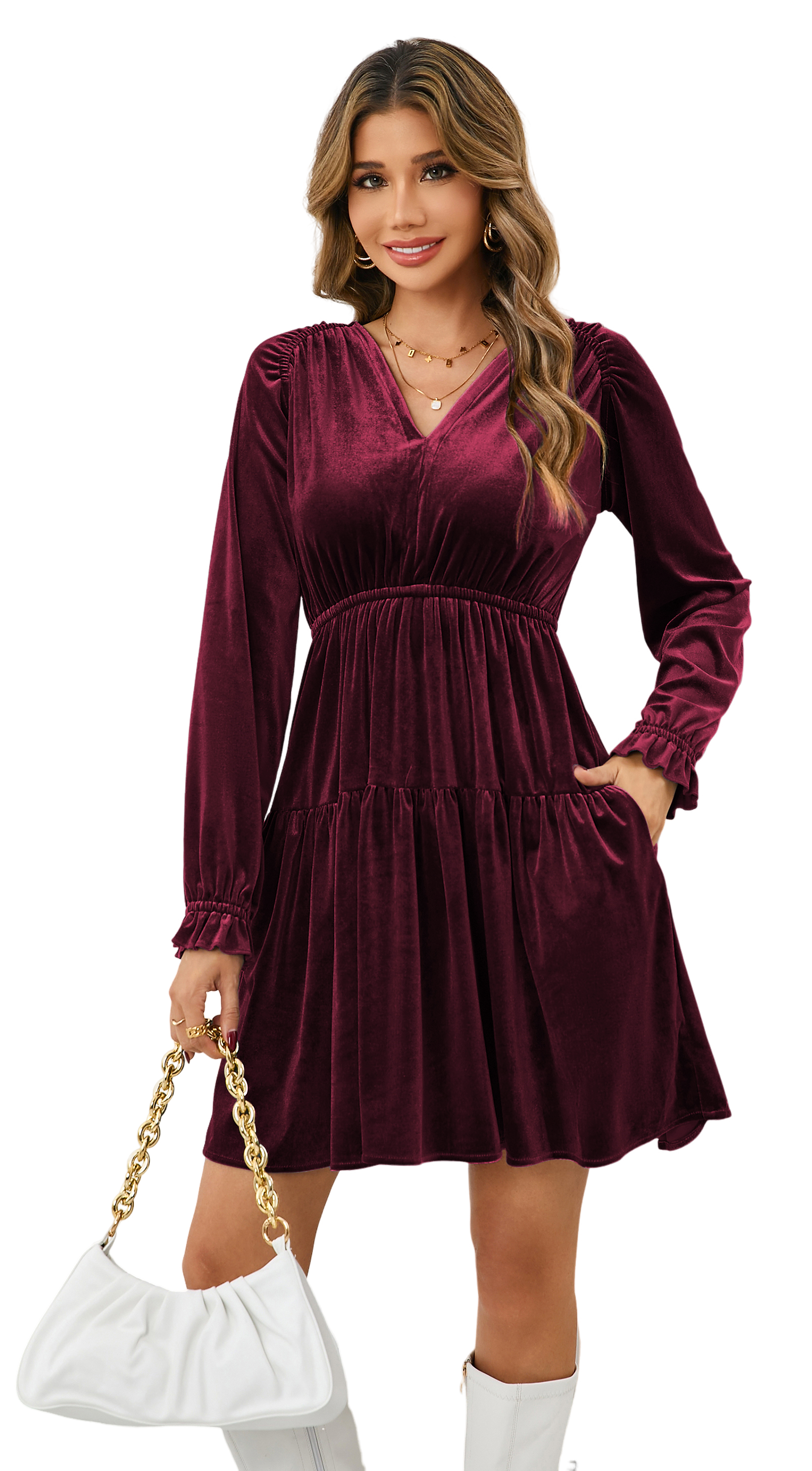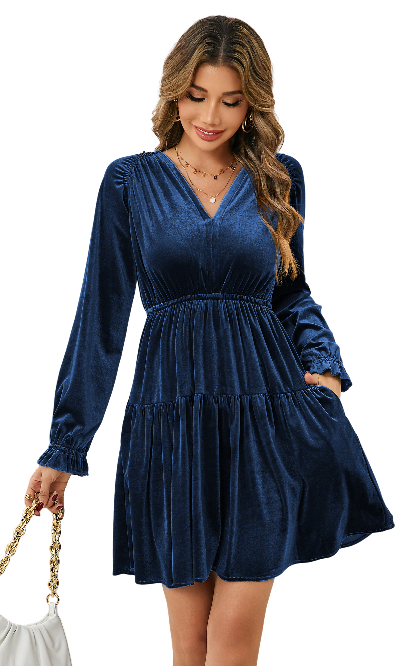 R.Vivimos Womens Fall Velvet Mini Dress V Neck Long Sleeve Elastic Waist Winter Tiered Flowy Swing A-Line Dress with Pockets 15