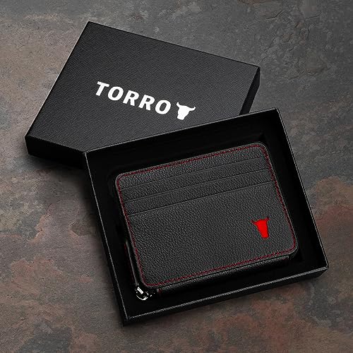 HOT ! TORRO Leather Card Holder with Coin Case – RFID Blocking Premium Leather Credit Cardholder with Zipped Coin Pouch (Black with Red Detail)