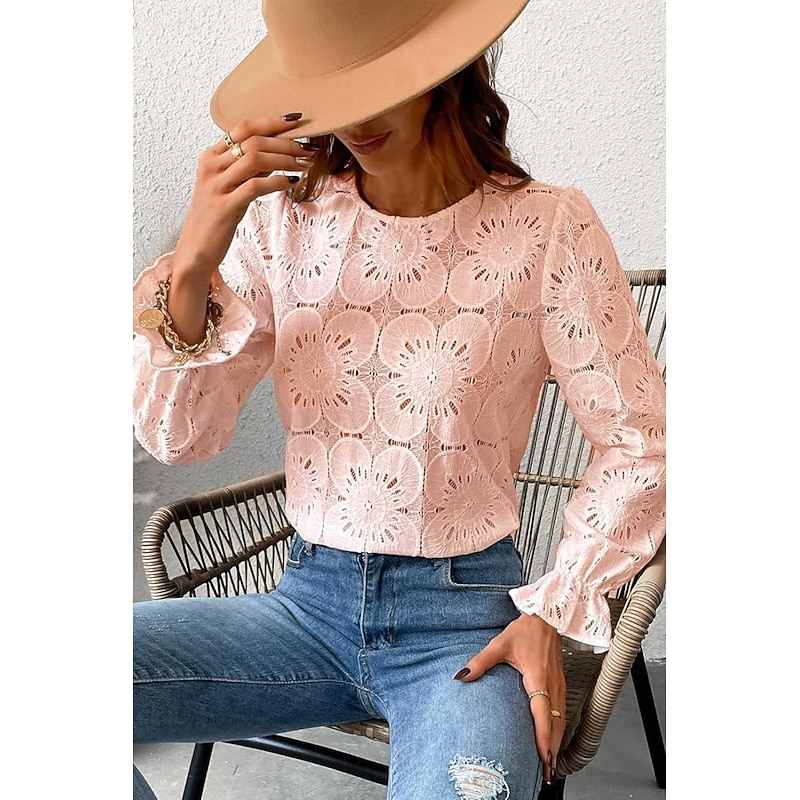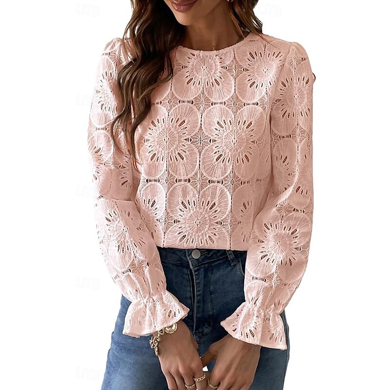 HOT ! Women's Lace Shirt Blouse Plain Active Casual Long Sleeve Crew Neck Regular Tops Daily Holiday Lace Black White Pink Light Blue Summer