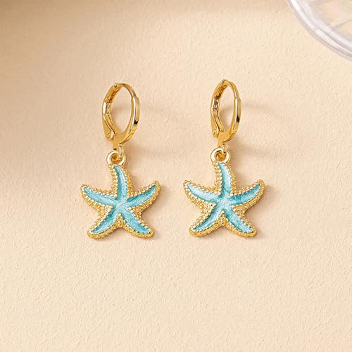 HOT ! Boho Starfish Sea Star Shell Enamel Dangle Hoop Earrings for Women, Trendy Gold Plated Dripping Oil Drop Huggie Earrings Hawaii Vocation Beach Party Ear Jewelry Gift